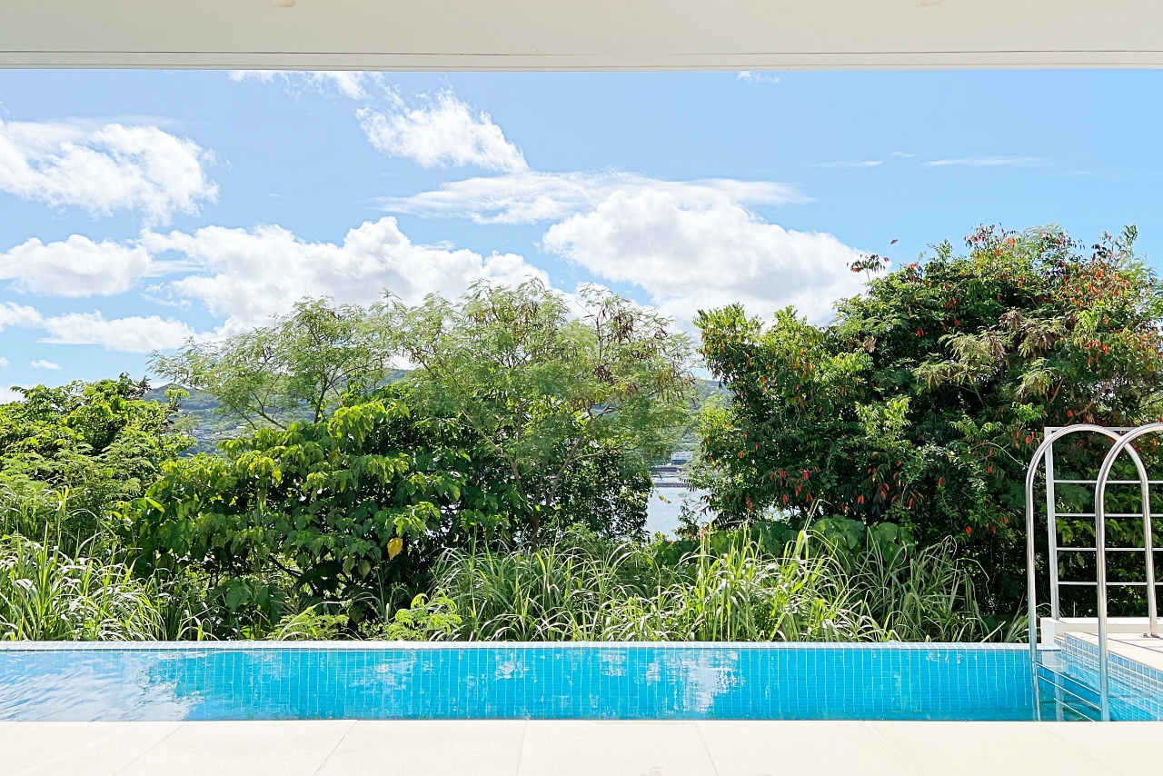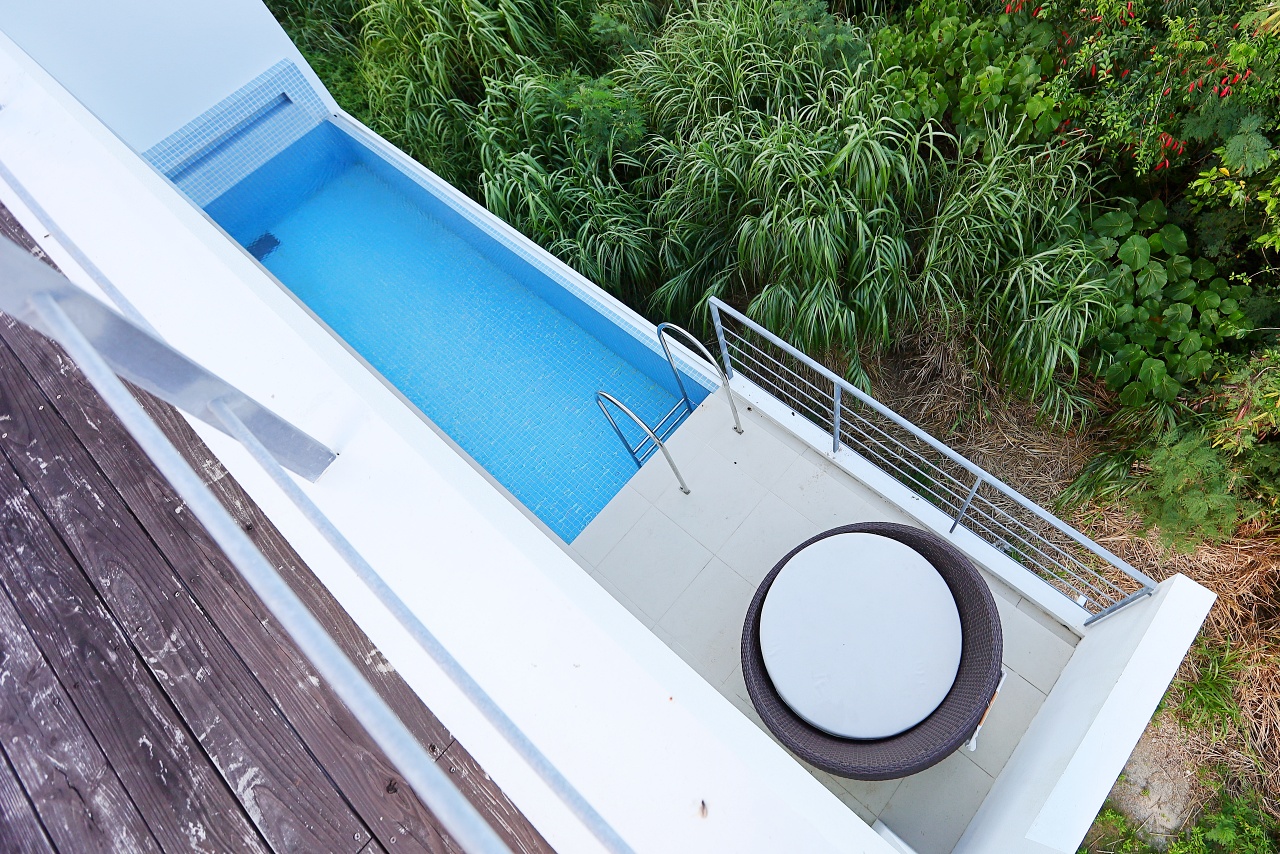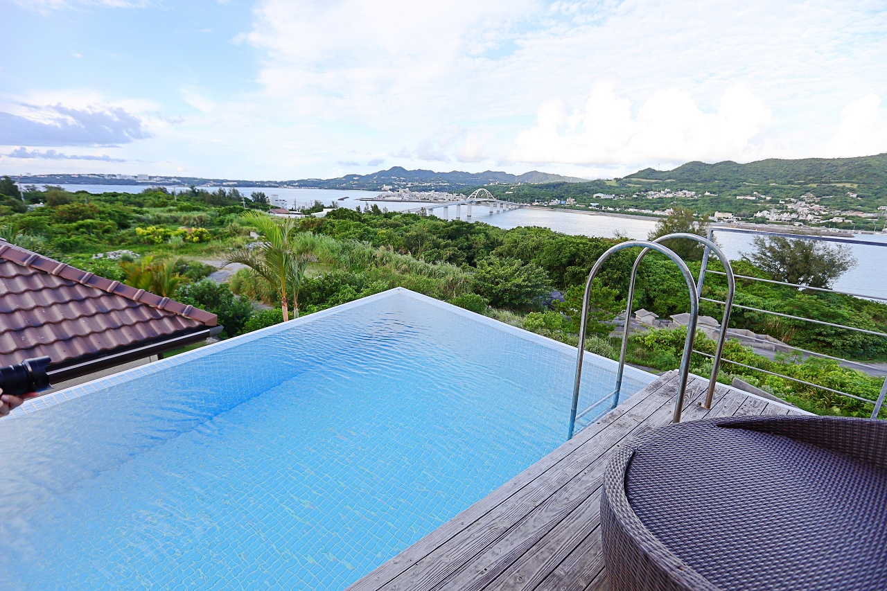 這裡的泳池是三角形設計,看起來像是居家雜誌的風格設計,非常有設計感,我好愛。而且視野超好,直接面對瀨底大橋跟海景,完全沒有遮擋。