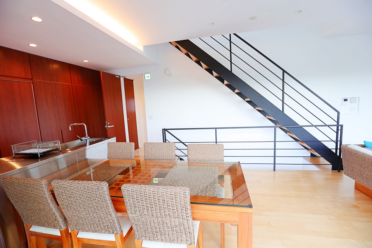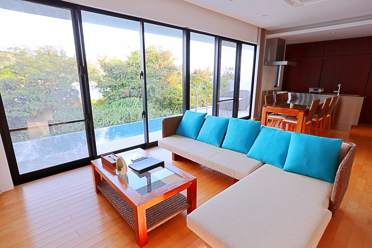 一走上樓梯到二樓就被眼前的畫面給美到不要不要的!落地窗外就是私人泳池,很寬敞的客廳包含開放式廚房和沙發區,我們馬上討論著晚上要去超市買在地料理回來做晚餐。