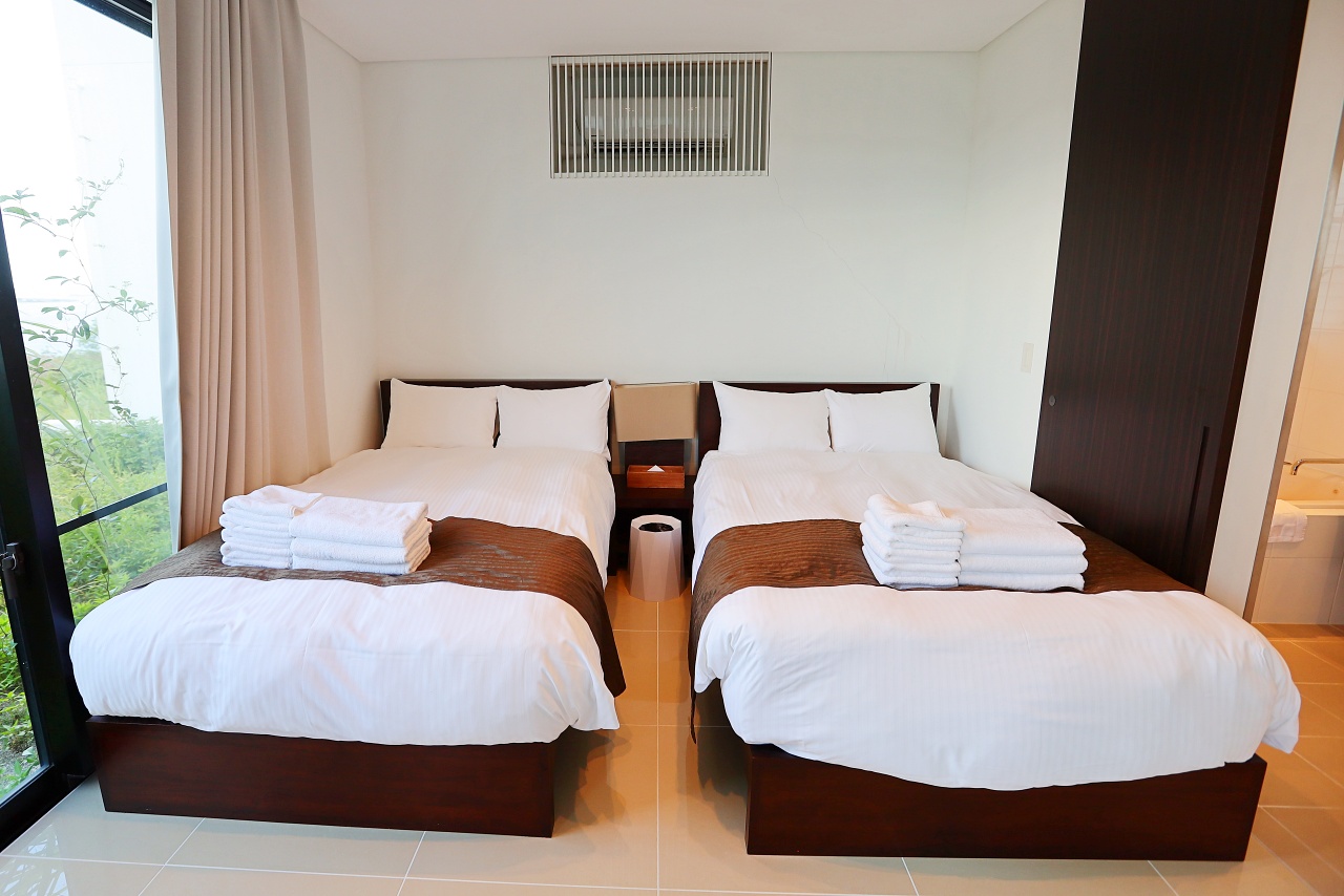 房間規格跟A棟大同小異,很喜歡有兩張大的雙人床,如果兩個人住就可以享受一人一大床了。房間是落地窗,即便是拉開窗簾也不擔心被看光光,窗戶外就是小山坡草叢了,浴室配有浴缸。
