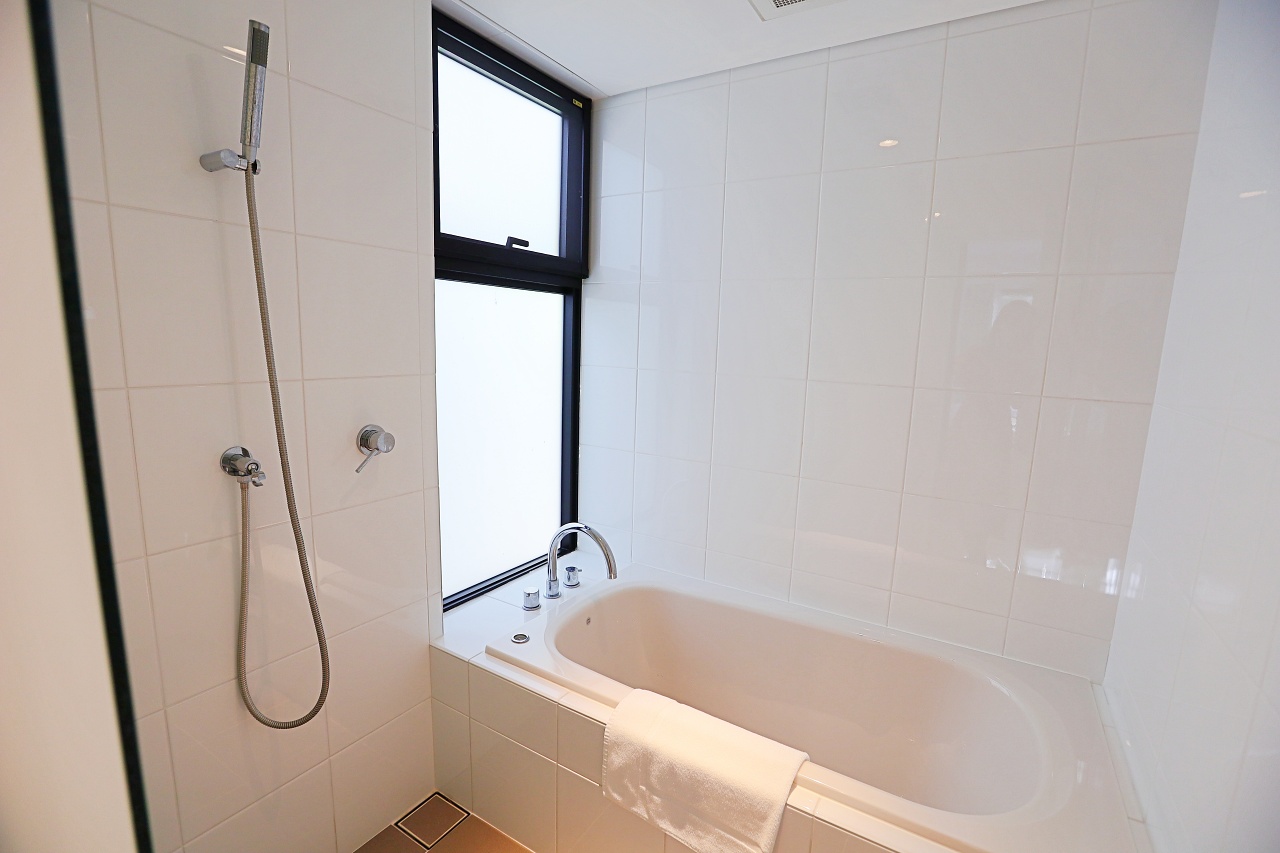 另一間的雙床房也是一樣的設計,房間靠近馬路,這邊設計的是小窗,浴室也有浴缸。而且有個讓豬飛感到很貼心的地方,房間內的大浴巾、毛巾都給滿給好耶。