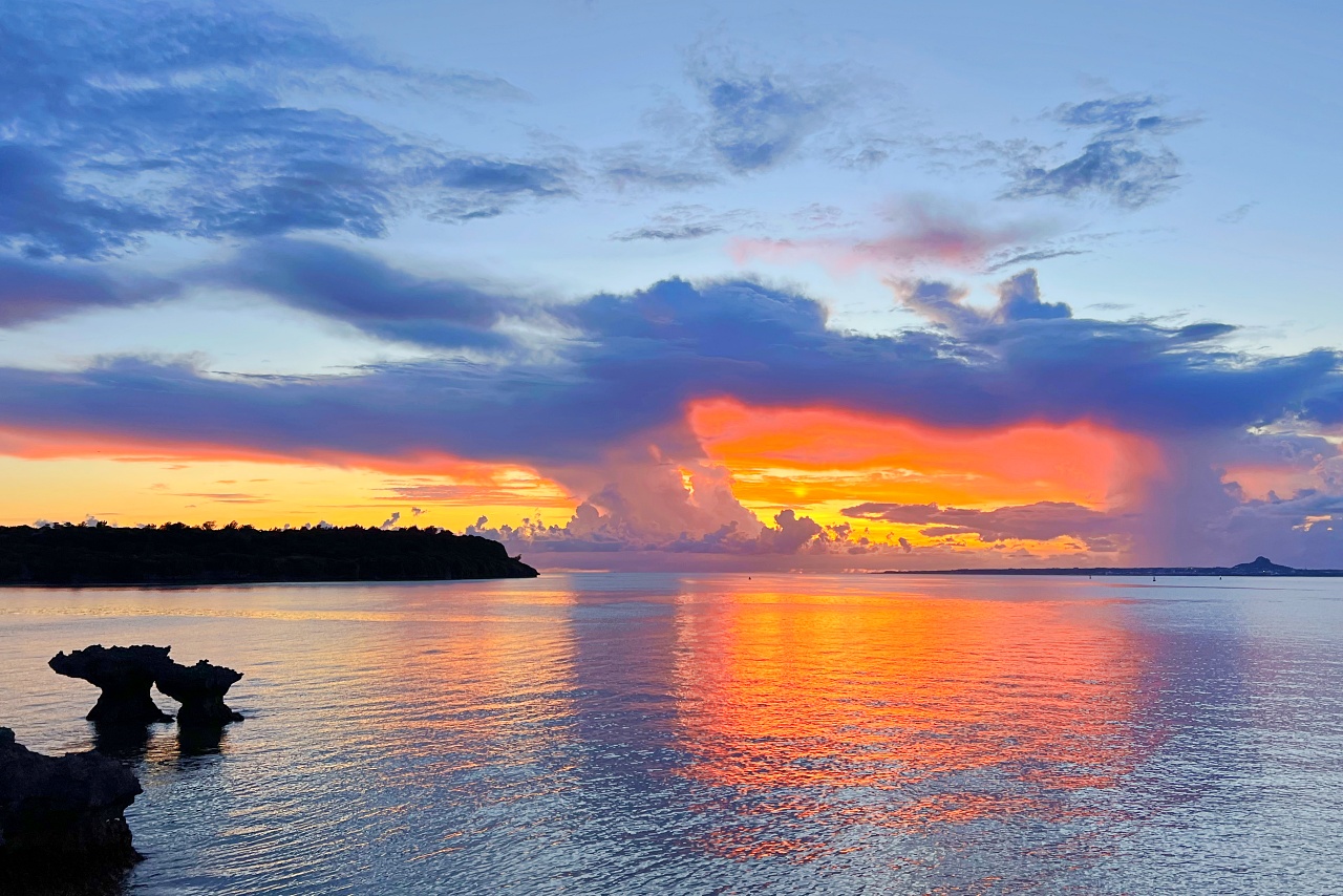 從瀨底大橋旁欣賞沖繩的夕陽,夏天7.8月的天氣很常有機會見到橘紅色的火燒雲,美的冒泡!