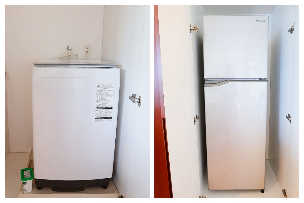 廚房後方的隱藏式木櫃打開有冰箱和洗衣機,一個家庭入住或是一群朋友來度假都非常方便。