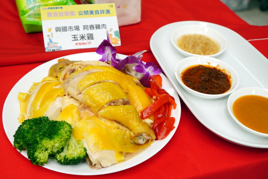 ▼「最強冠軍雞」季軍則由興國公有零售市場的阿香雞肉「玉米雞」所獲得,採用新鮮玉米雞慢火熬煮而成,肉質鮮甜有嚼勁,一旁還附有三種醬料,都可以搭配享用。