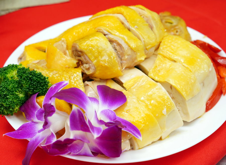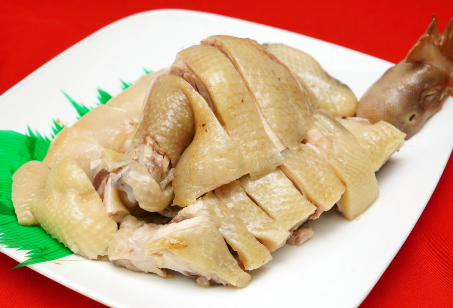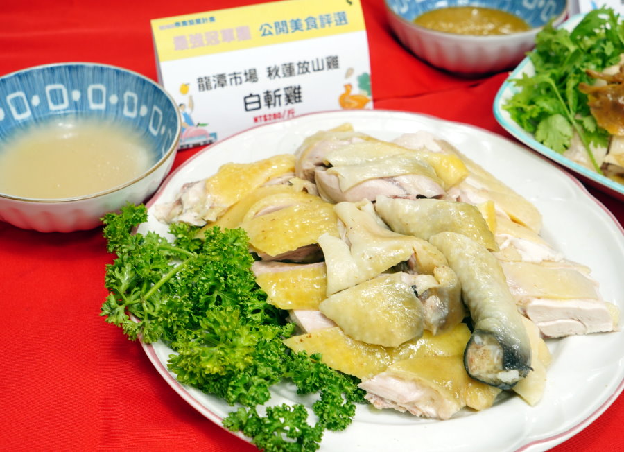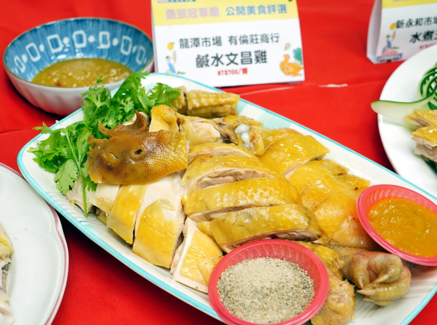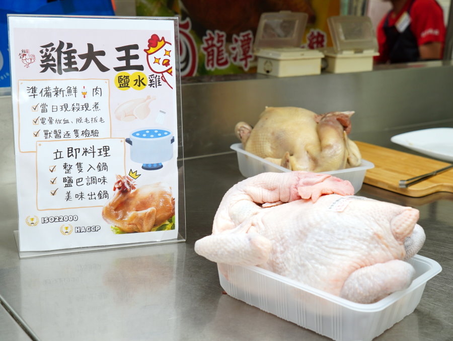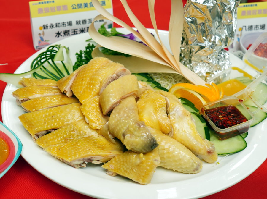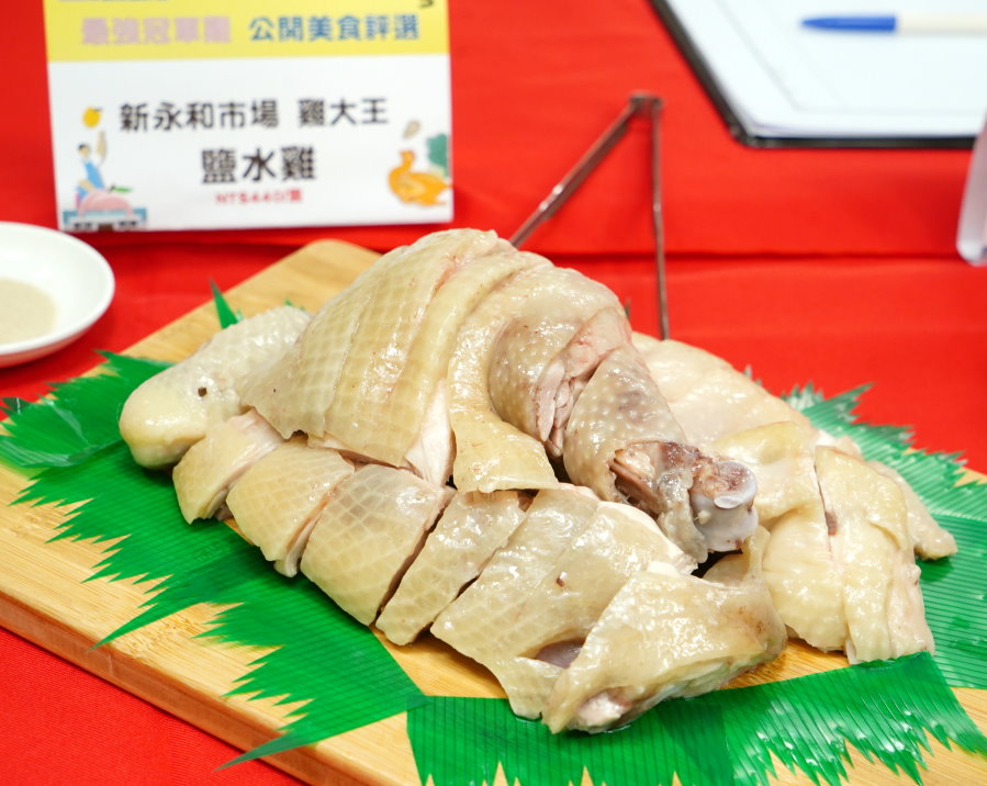 ▼評審團推薦賞則是由新永和公有零售市場的雞大王「鹽水雞」獲得,雞大王本身在八德就有自己的屠宰場,每一隻雞都有經過獸醫檢驗合格,採用電宰放山溫體雞,新鮮活雞現殺現煮,在中央廚房電暈後直接進行放血、脫毛、拔毛等流程,整雞肉直接入鍋以鹽巴調味,做出鮮嫩美味的鹽水雞,從頭到尾都是一條龍作業,品質也有一定保證。