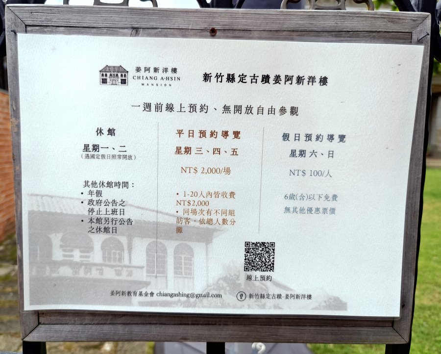 ▼姜阿新洋樓每週一、二固定為休館日(遇國定假日照常開放),平日週三、四、五及假日皆可預約導覽,有興趣的朋友記得提早線上預約唷!
