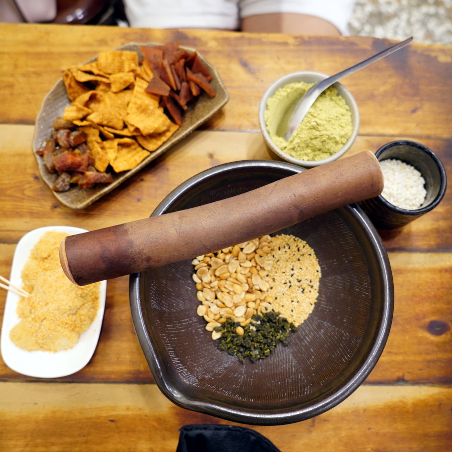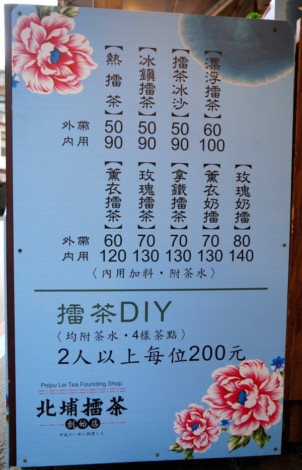 ▼既然都來北埔了,當然要來個擂茶DIY試試;老闆娘上桌的時候,還會跟客人解釋一下擂茶的由來,擂茶是客家族群招待貴賓所用的茶點,又稱之為三生湯,相傳三國時代就有擂茶,魏晉南北朝隨著客家先民移入,逐漸就有客家擂茶文化;以前擂茶是鹹的口味,當茶湯食用,有點類似日本茶泡飯的概念,後來店家將鹹口味改為甜口味,搭配多元的配料,將擂茶變得更加養生。