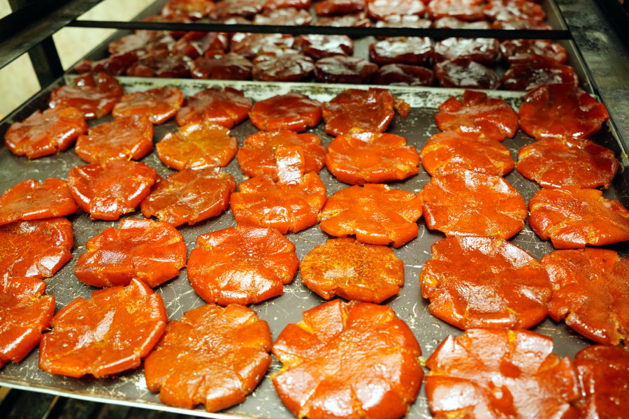 ▼另一項蜜柑也是店內招牌之一,還有獲選為59屆金馬獎官方紀念禮盒,也是人氣很旺的商品!採用在地友善栽種無毒桶柑,採用手工古法蜜製、慢火熬煮而成,製作過程繁瑣費工,最後還要乾燥、包裝,至少費時一週才能完成,當天剛好有蜜柑的半成品,一字排開好療癒啊!