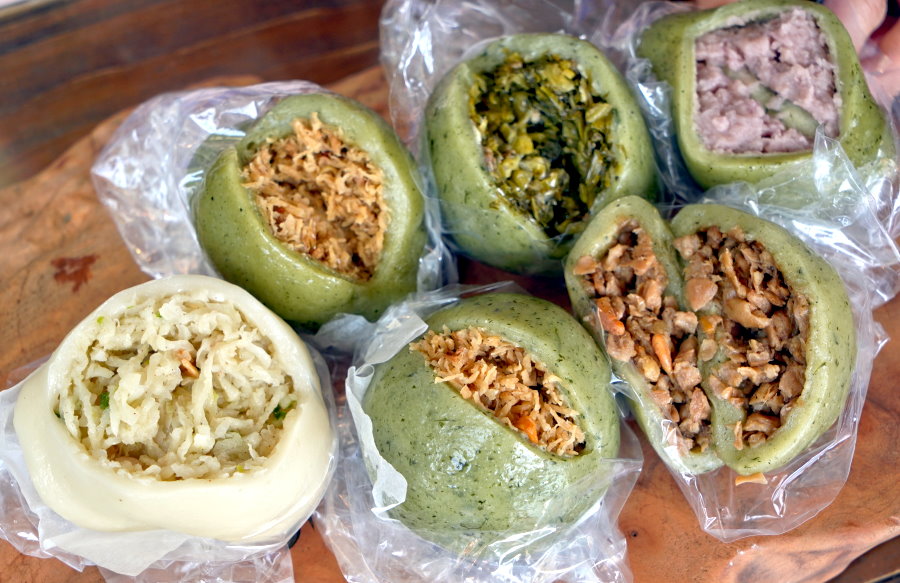 ▼客家酸菜包、採用在地小農自耕自醃的酸菜,搭配豬絞肉、胡椒等包製而成,吃起來帶點酸勁與辣度,微微脆口感與Q彈的外皮顯得層次更多元;素蘿蔔絲菜包,包裹著乾蘿蔔絲、香菇、豆乾、素麵輪,吃起來比印象中的素菜包來說香氣更足,口感也不單調,算是好吃的素菜包!芋泥艾草包、以甜芋泥入餡,微甜不膩加上綿密的口感,既能吃到芋頭香氣也能襯出艾草的芬芳,算是很特別,同樣也是素食者可食的口味!