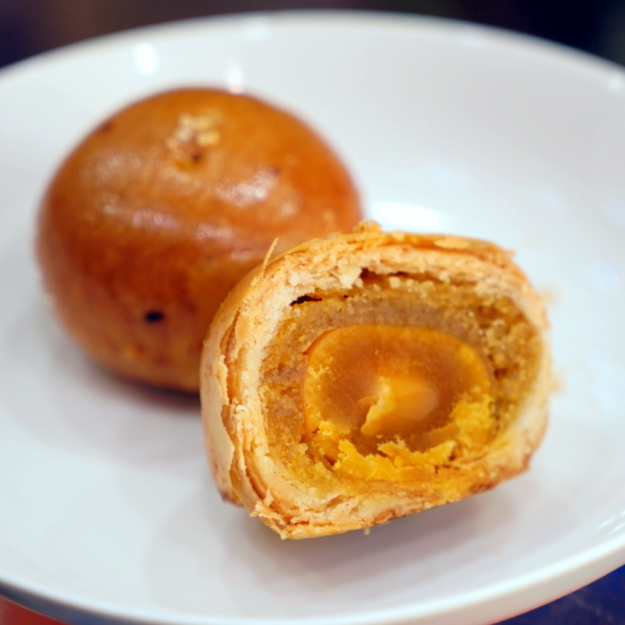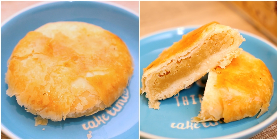 ▼月光蛋黃酥也是店內獨創商品,採用地瓜內餡搭配烘烤過的鹹蛋黃,剛出爐的外皮更是香酥脆口,加上帶點蜜香的地瓜內餡、鹹蛋黃頗為合拍,吃起來也較不膩口,真的很特別!