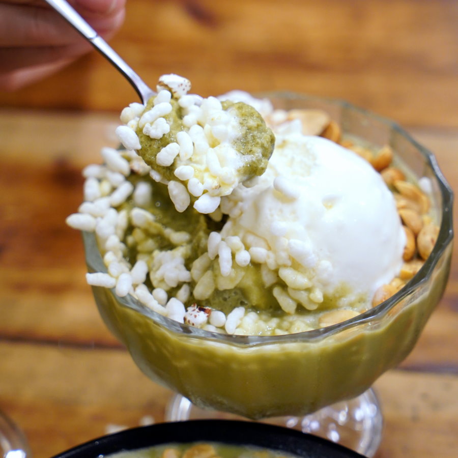 ▼漂浮擂茶,也就是冰沙上頭除了炒米、花生之外,還多了一球冰淇淋,醇厚茶香中增添一股滑順奶香,我們也很喜歡這樣的搭配!