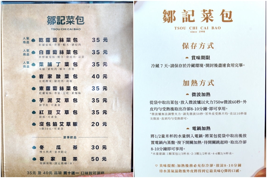 ▼鄒記菜包菜單,上頭還有貼心標示內容物及人氣商品,讓人清楚明瞭!除了外帶之外,也有提供宅配服務,冷藏可保存七天,使用微波或電鍋加熱即可享用熱騰騰的美味菜包!