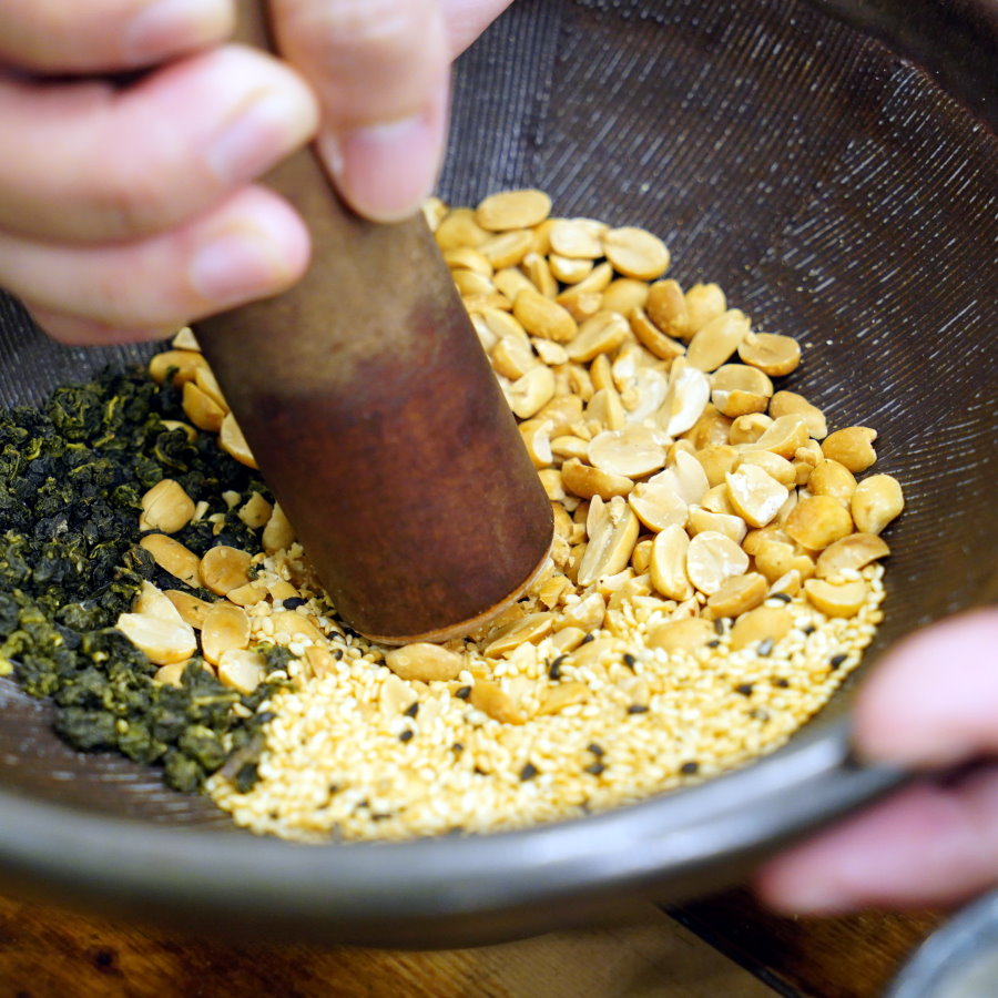 ▼擂有研磨、敲打之意,茶則是茶葉,使用擂缽、擂棒去研磨,擂茶的基底是花生、芝麻、茶葉,等到研磨至出油、均勻細緻之後,再加入精心調製的擂茶粉,將兩者研磨均勻後,加入熱水,撒上炒米,就是一杯香濃醇厚的客家擂茶。