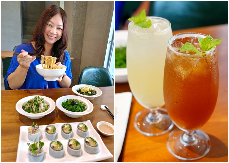 ▼粄條手捲,採用純米粄條包裹有機苜蓿芽、有機豌豆苗、蘋果、小黃瓜、葡萄乾、香鬆、海苔等配料,吃起來Q彈帶有米香,加上多元的配料營造出不同層次口感,搭配特調胡麻醬更是迷人,清爽又順口的味蕾讓人忘記它其實是蔬食料理啊!