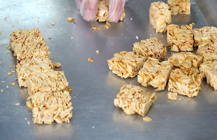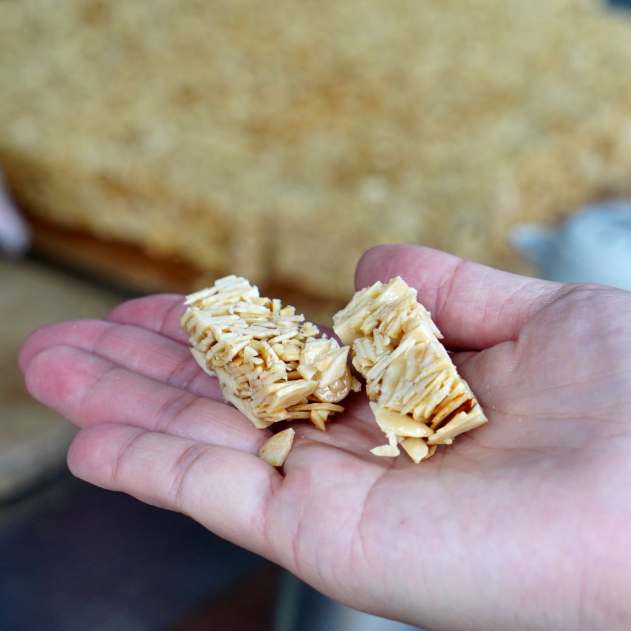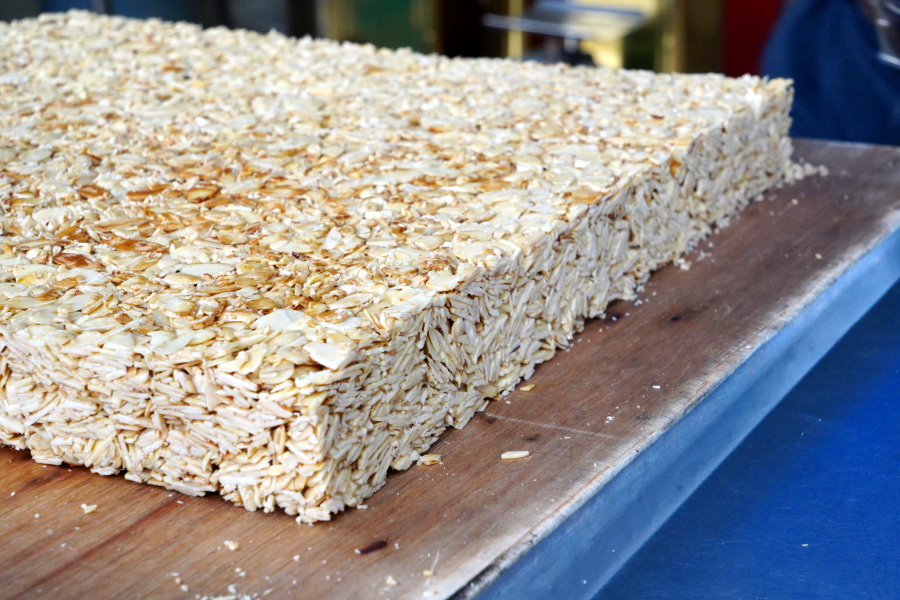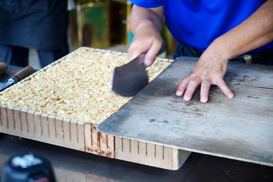 ▼拌炒好的杏仁酥糖要立刻倒進木製的模具內,用刀抹平後再來分切,之後再由服務人員用扇子扇涼即可分裝,同時也會讓現場朋友試吃一下熱呼呼的杏仁酥糖跟冷的有什麼差別!
