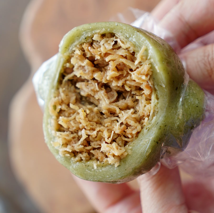▼乾蘿蔔絲菜包,裡頭有乾蘿蔔絲、香蔥、蝦米、豬絞肉等配料以豬油煸炒作為內餡,再以糯米搭配艾草包裹而成,吃得到帶點Q勁的外皮,淡雅的艾草香氣與乾蘿蔔絲、豬油、蝦米香味一入口就在嘴中迸開來,加上微微辛香的胡椒提味,算是很耐吃的經典口味!
