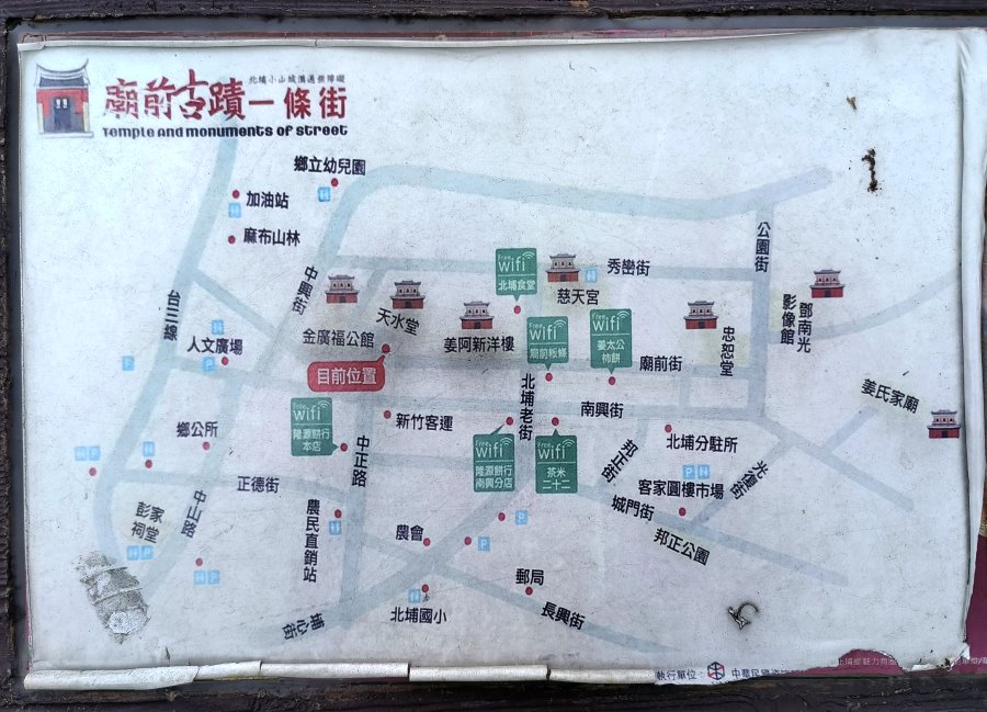 ▼大口將這次要走訪的美食、古蹟先標示出來,提供給大家參考!(北埔地圖出自於山城北埔官方粉絲團,作者為劉美熙)