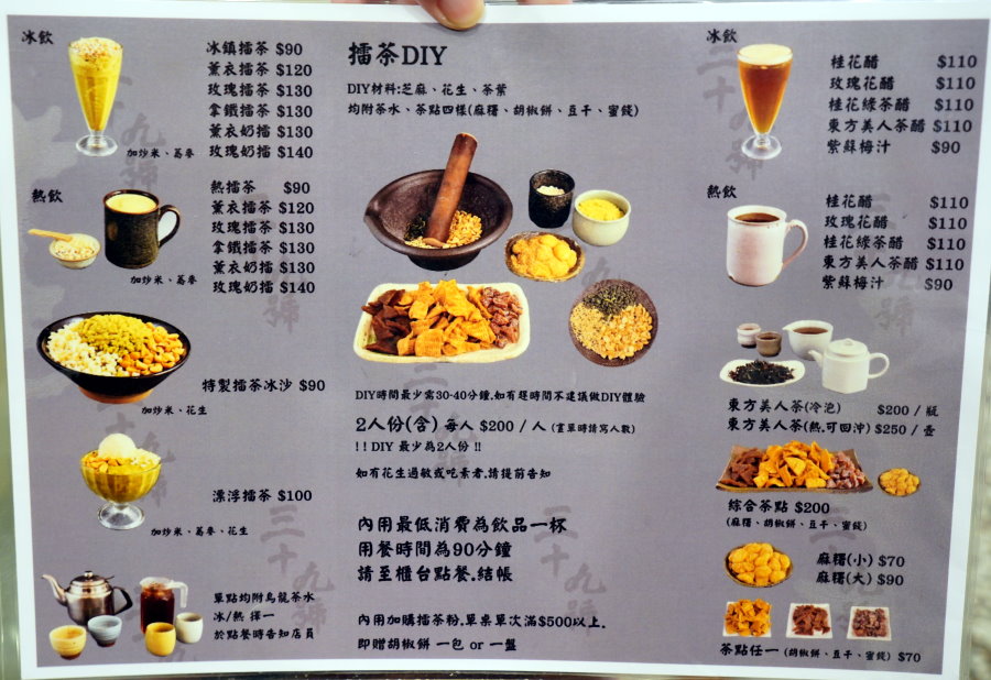 ▼三十九號北埔擂茶創始店菜單,冷熱飲品通通有,選擇還不少!