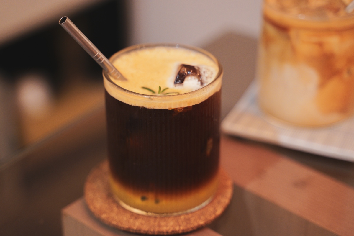 菜單上的飲品選擇蠻多,咖啡飲品、鮮奶茶基本的都有,由於中午的餐店對我來說已經算是一餐亂吃,接著吃甜點,糖量肯定爆掉,我就不喝脂肪偏多的義式咖啡,選了百香果鳳梨黑咖啡,攪拌均勻後的百香果汁與黑咖啡酸香酸香的,有著果香與咖啡香,甜度並不高,很好入口不卡喉嚨,有些店家會加糖來調和降低酸度,可每個人的感受不同,就不一定合口味。蠻喜歡這杯百香果鳳梨黑咖啡,很清爽~