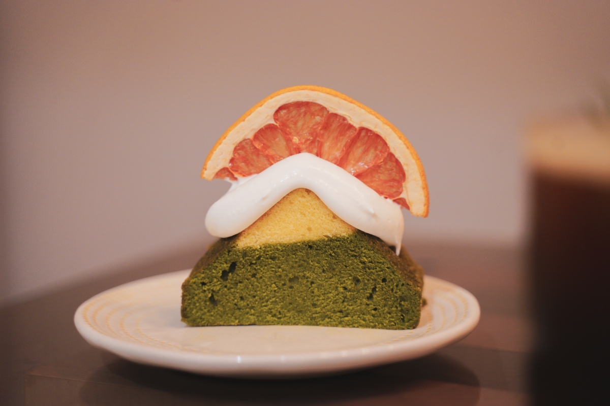 抹茶磅蛋糕,富士山造型的抹茶磅蛋糕,抹上一層鮮奶油,搭配葡萄柚果乾。磅蛋糕真的有點太乾,口感不是很喜歡,最後還是朋友幫忙吃光光的啊哈哈哈哈哈。