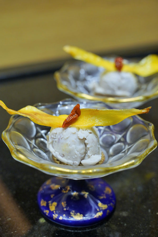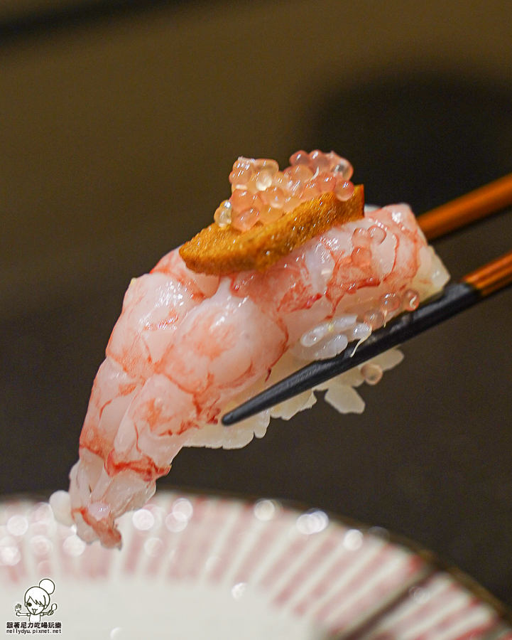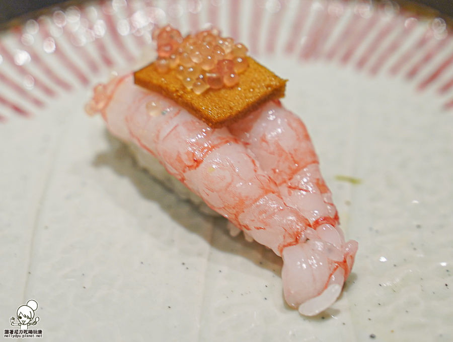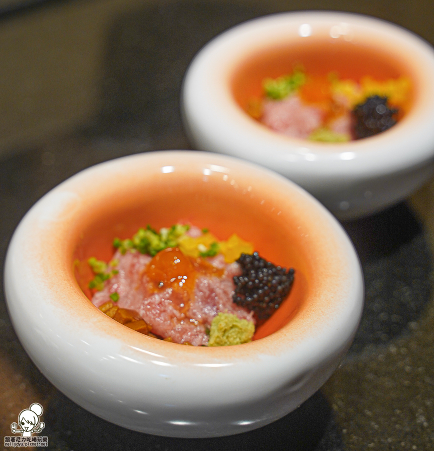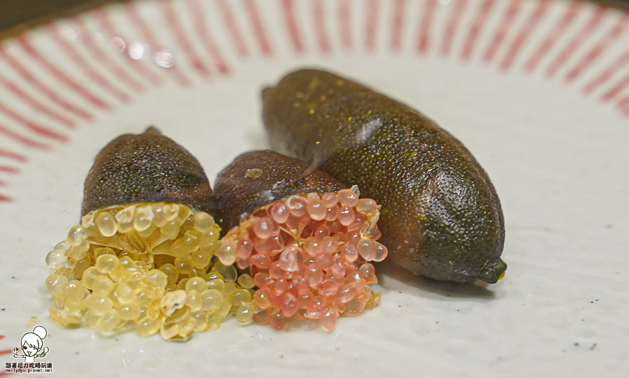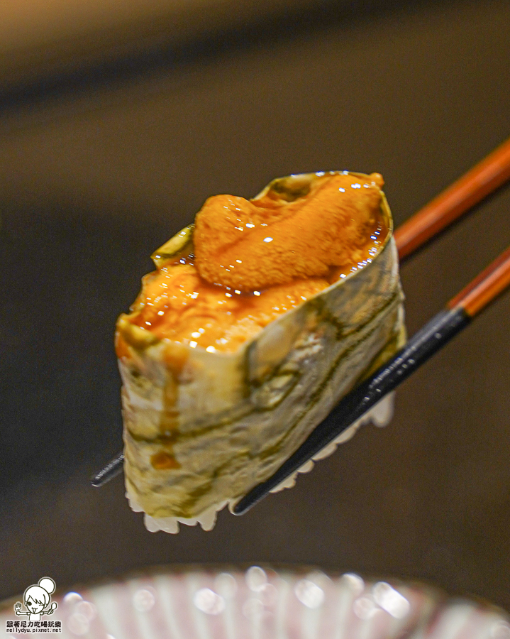 使用昆布片包覆製作,白海膽上面還淋上主廚特製海膽醬油提味