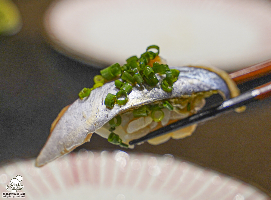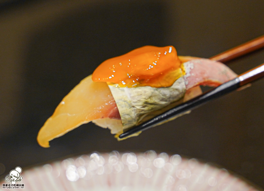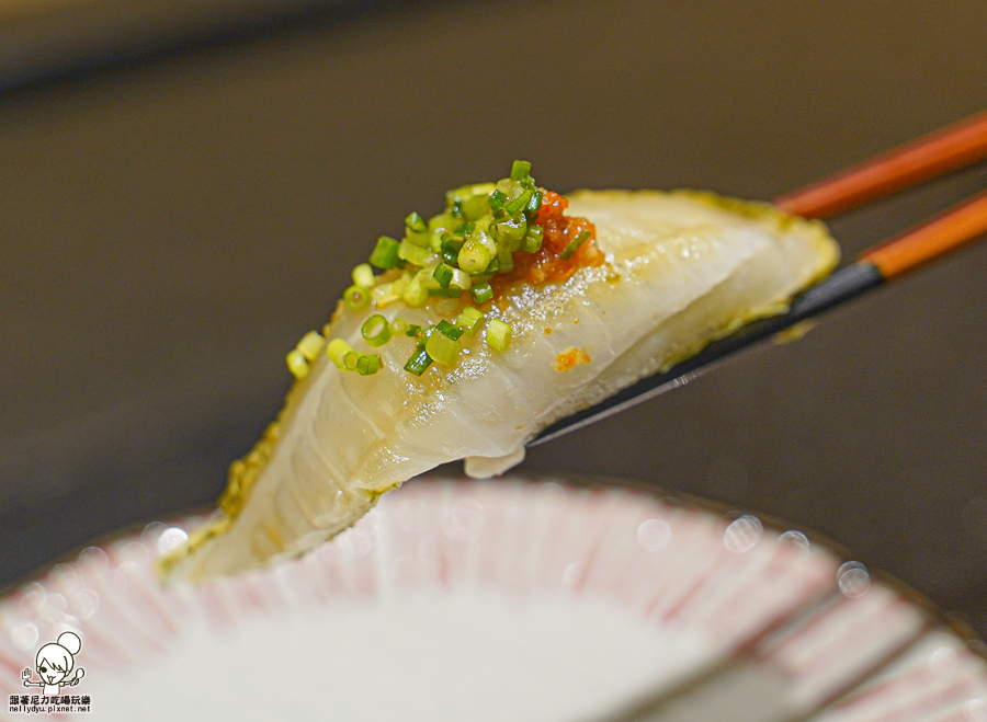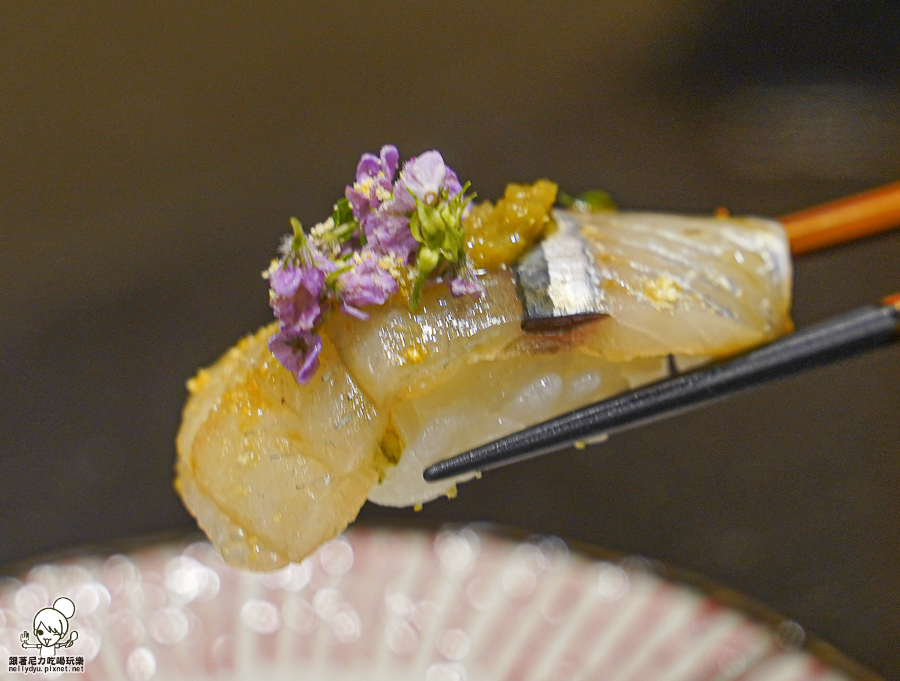 每一貫都是主廚獨門調味,澎湖水針魚搭配紫蘇花
