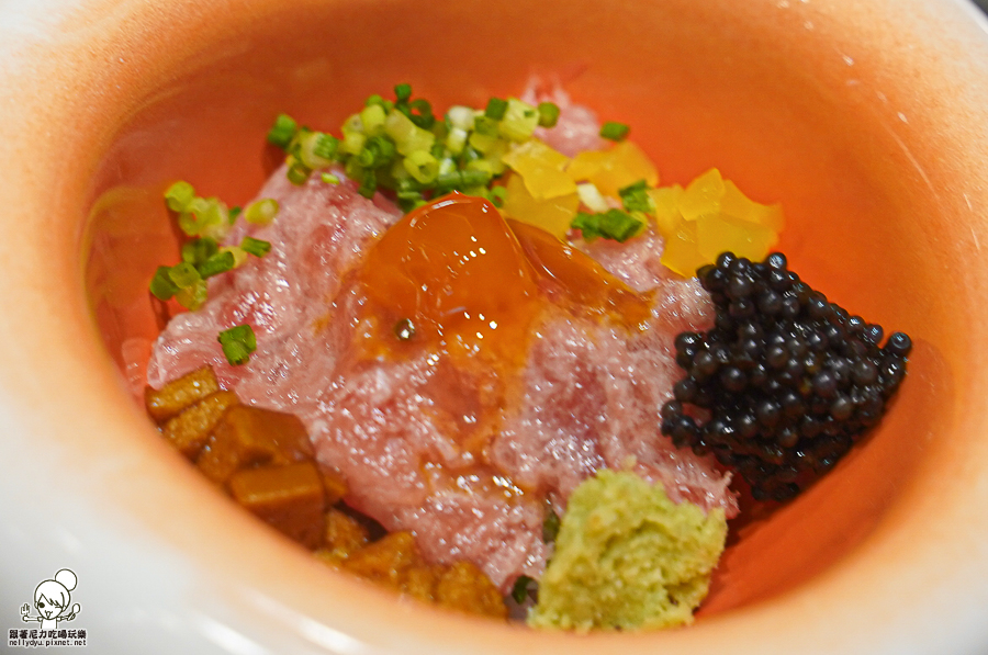 新鮮芥末、醃製蛋黃、日本細蔥、日本醃黃蘿蔔、魚子醬