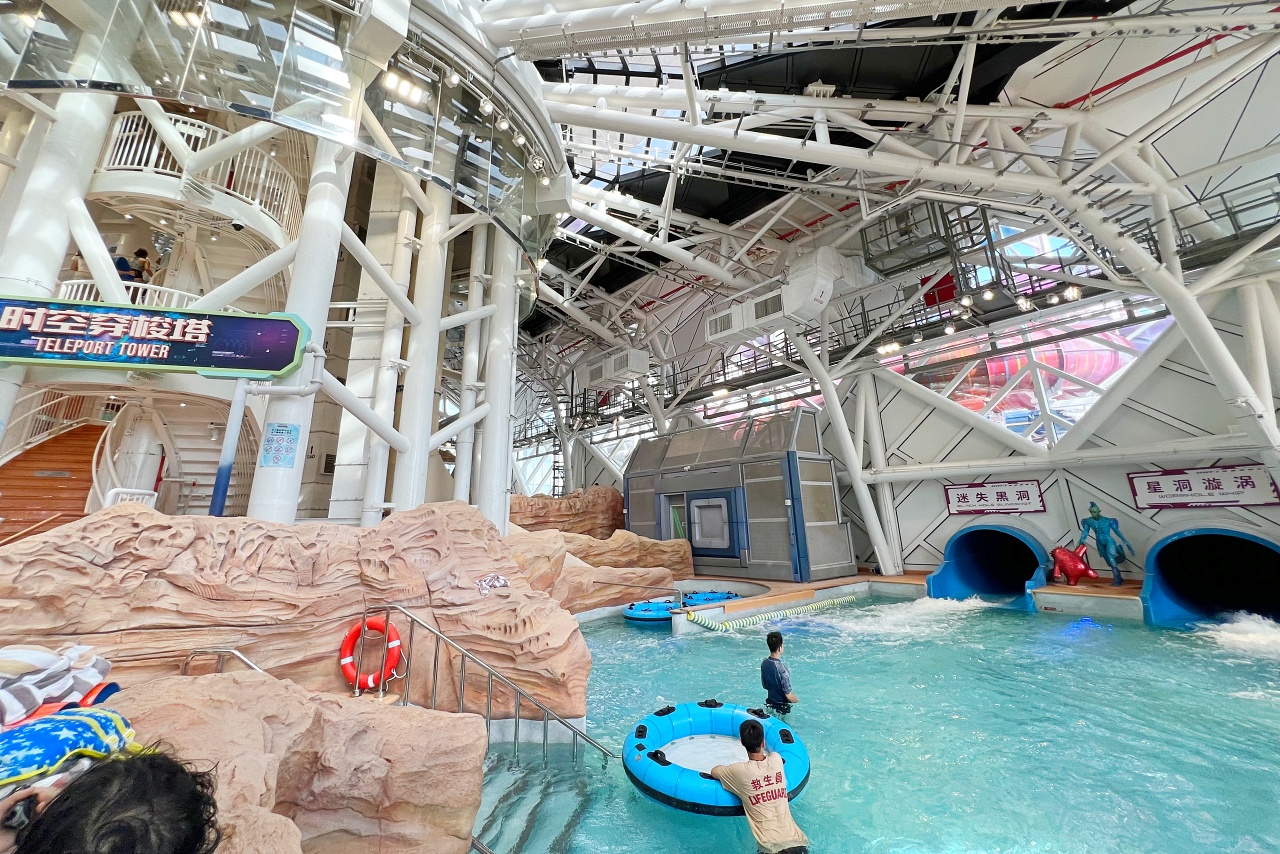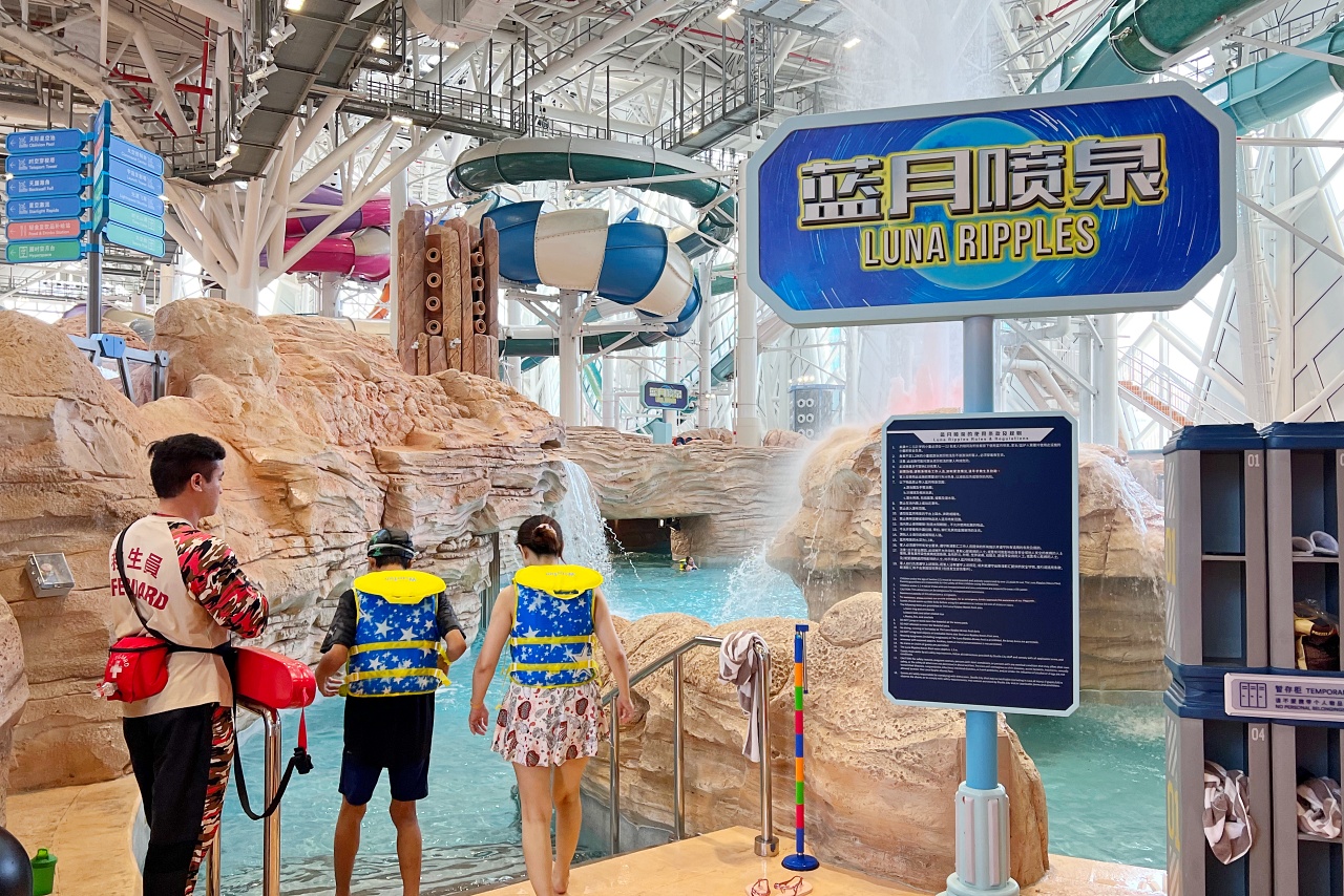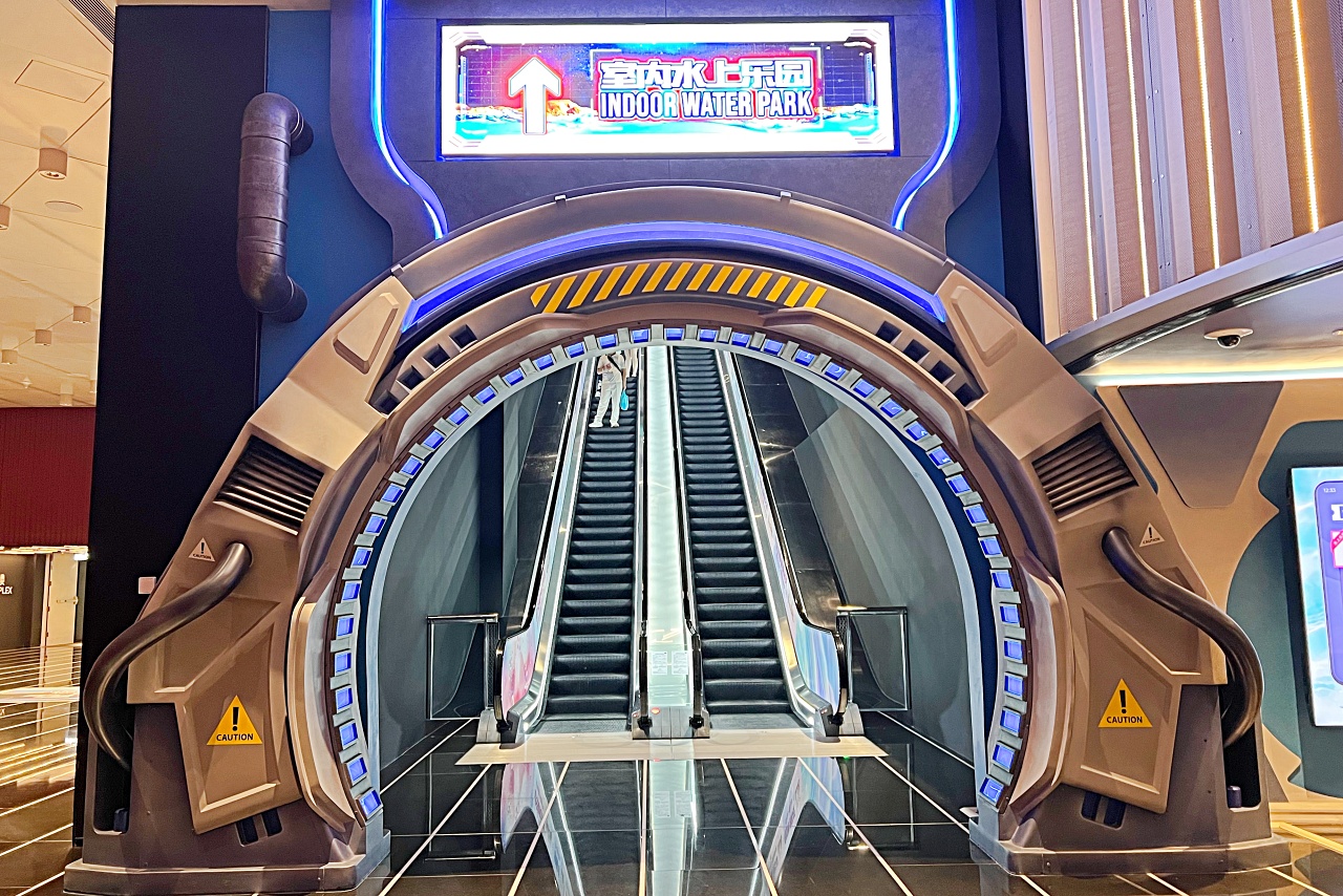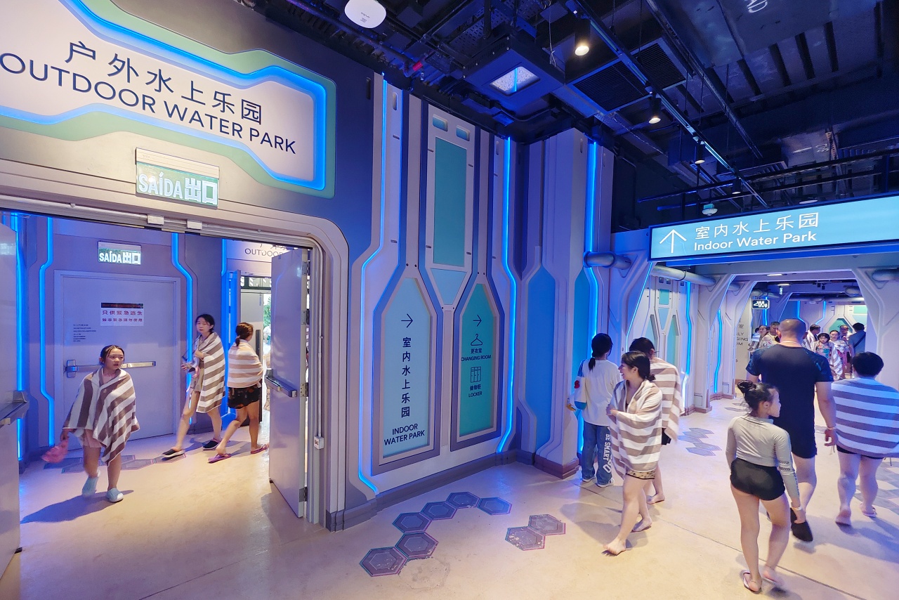 走到區一邊是往室內水上樂園、一邊是往戶外水上樂園,像極了走在太空艙裡,充滿科技未來感。