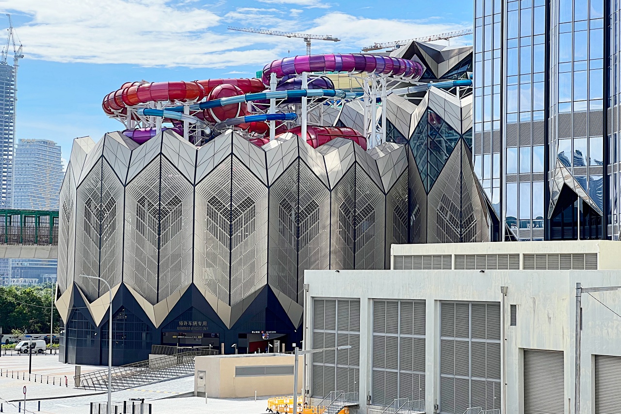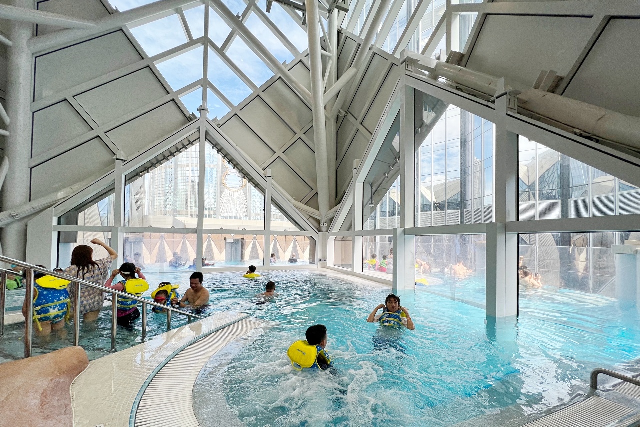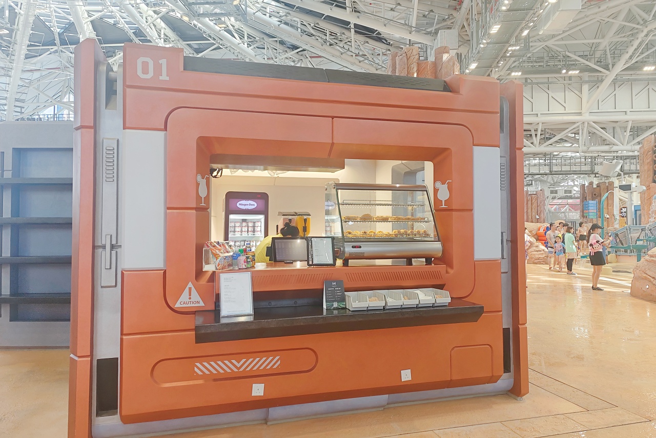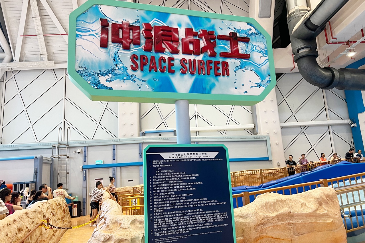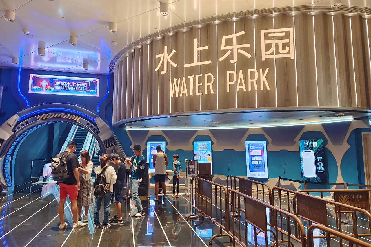 走到區一邊是往室內水上樂園、一邊是往戶外水上樂園,像極了走在太空艙裡,充滿科技未來感。