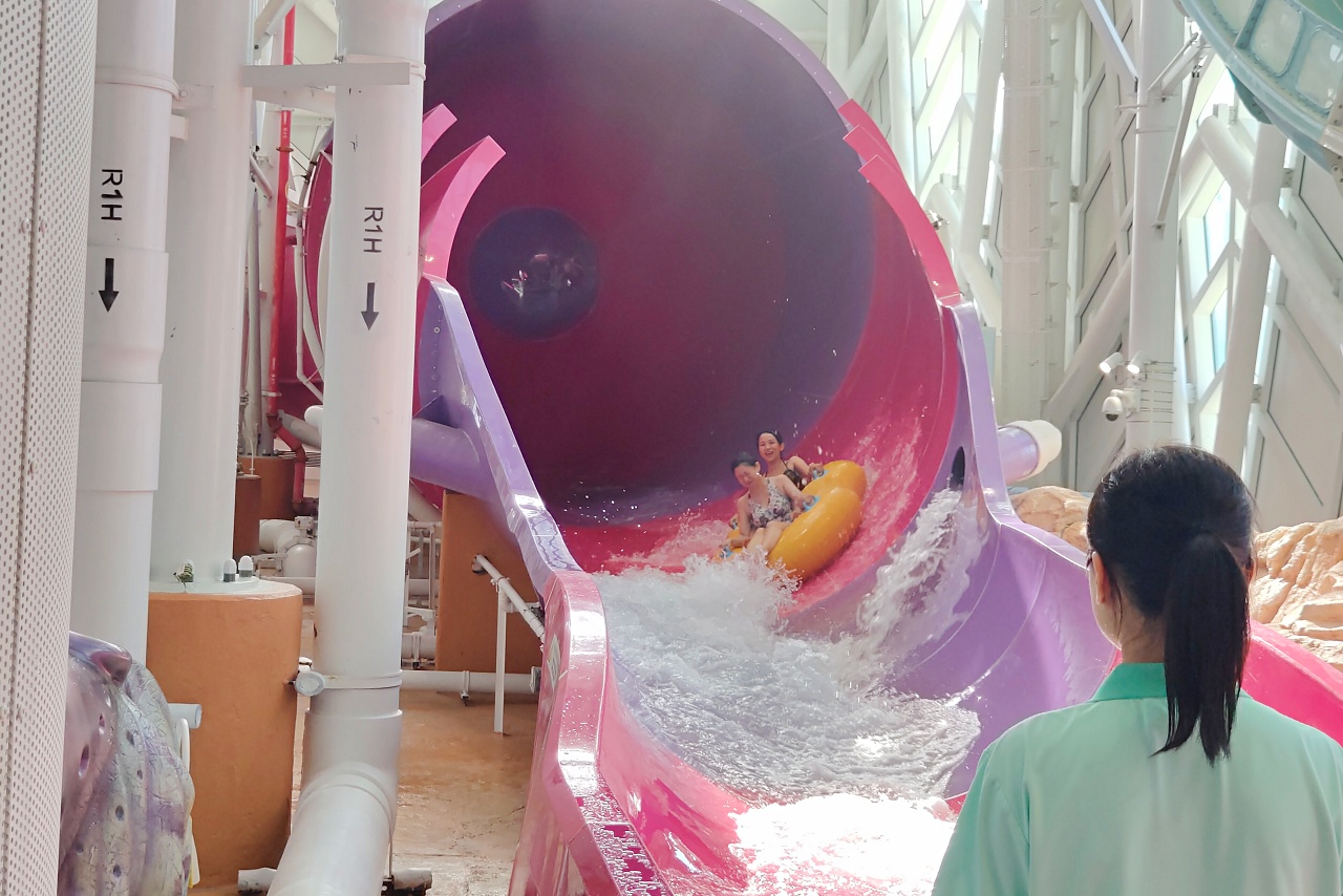 來到室內最高的滑水道,在塔頂能夠直接俯瞰室內空間。結合高速急轉彎和陡峭下降、重力加速度的擺盪,在360度的水道裡面飛高高,刺激度破表。