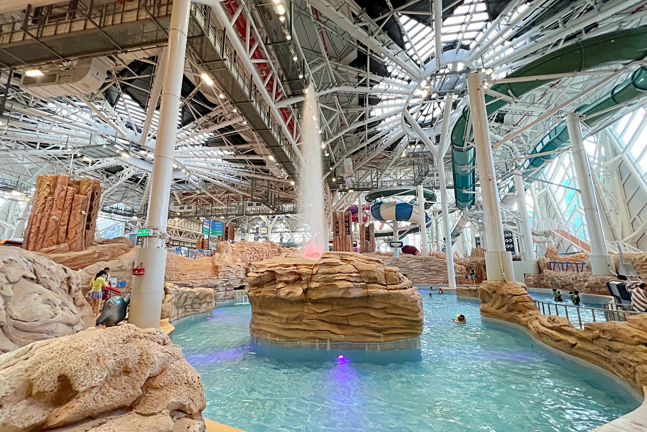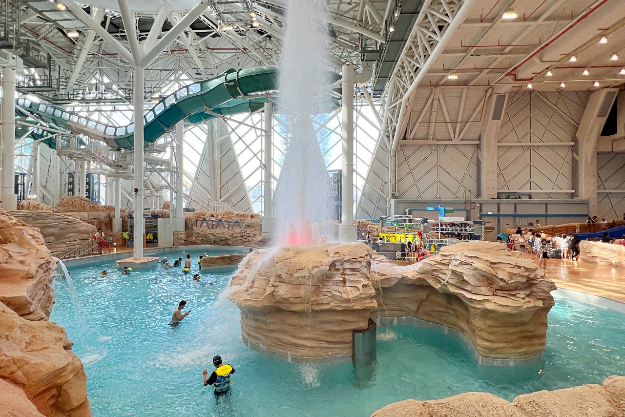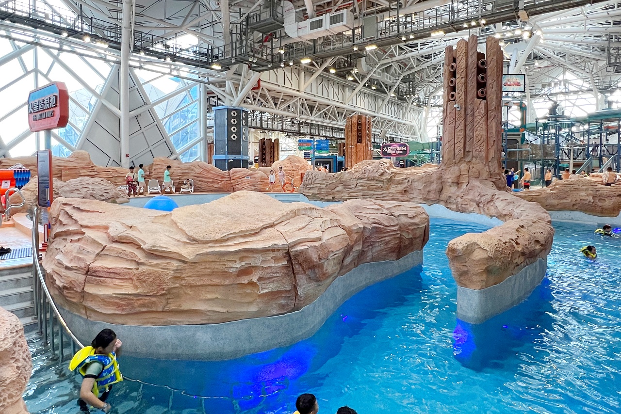 噴泉在岩石上噴發而出,打造出翻騰的浪花,在這個巨大的水池裡盡情的享受水裡的透心涼,小朋也也很適合玩喔。