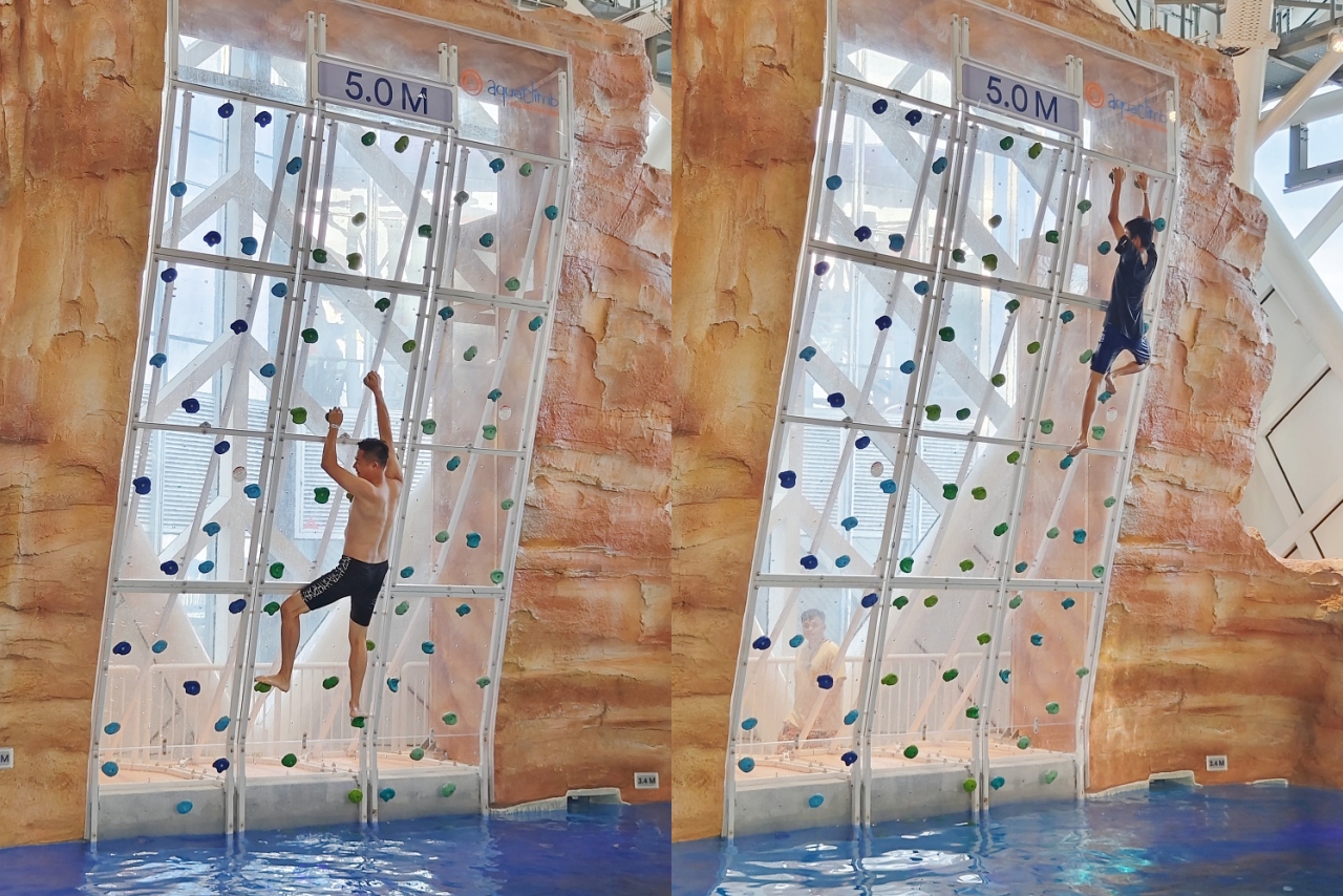 這個很耗體力的水中攀岩,要先游到底再往上攀爬,這時候就是比誰的臂力好了,爬到頂端再一躍而下跳進3.7米的水池中。