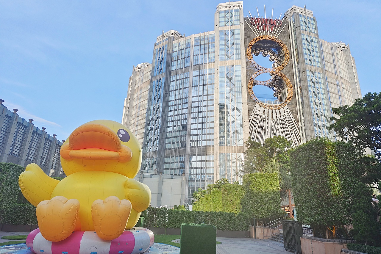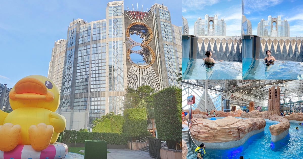 天氣超好的8.9月,看到黃色小鴨和8字摩天輪就知道是新濠影匯的代表了。一家大小都很適合在新濠水上樂園度過快樂的玩水時光,戶外空間很大,設施包括有激戰20米高 「沖天水龍捲」5條滑水道;戶外漂漂河、備受矚目的「黃金大水桶」定時傾倒,室內設施玩一玩,記得保留體力繼續玩戶外設施喔!我們一群人光是玩了室內就累慘了,完全沒體力跟戶外滑水道繼續奮鬥。