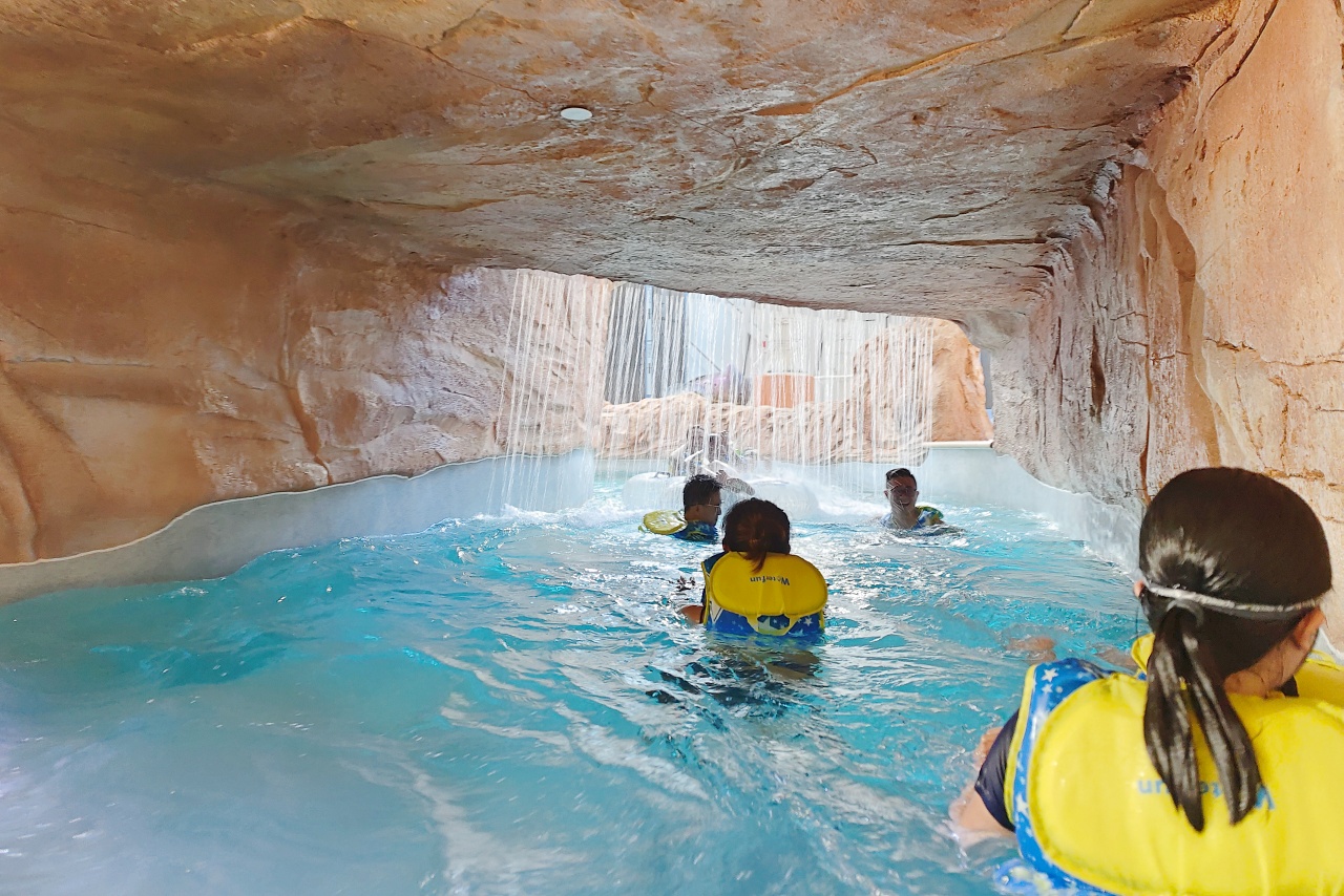 這裡堪稱是進階版的漂漂河,長達246米的水道有水簾、瀑布、噴霧,底下的水流很快,我們就在裡面飄啊飄的繞了好幾圈。這也是豬飛喜歡的設施之一,可以整個人放空,隨著水流到處飄去。