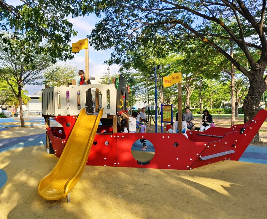 ▼東港1號大船區,紅色的大船造型搭配黃色滑梯很吸睛,這一區比較適合小小孩玩耍,同樣也有攀爬設施與溜滑梯!