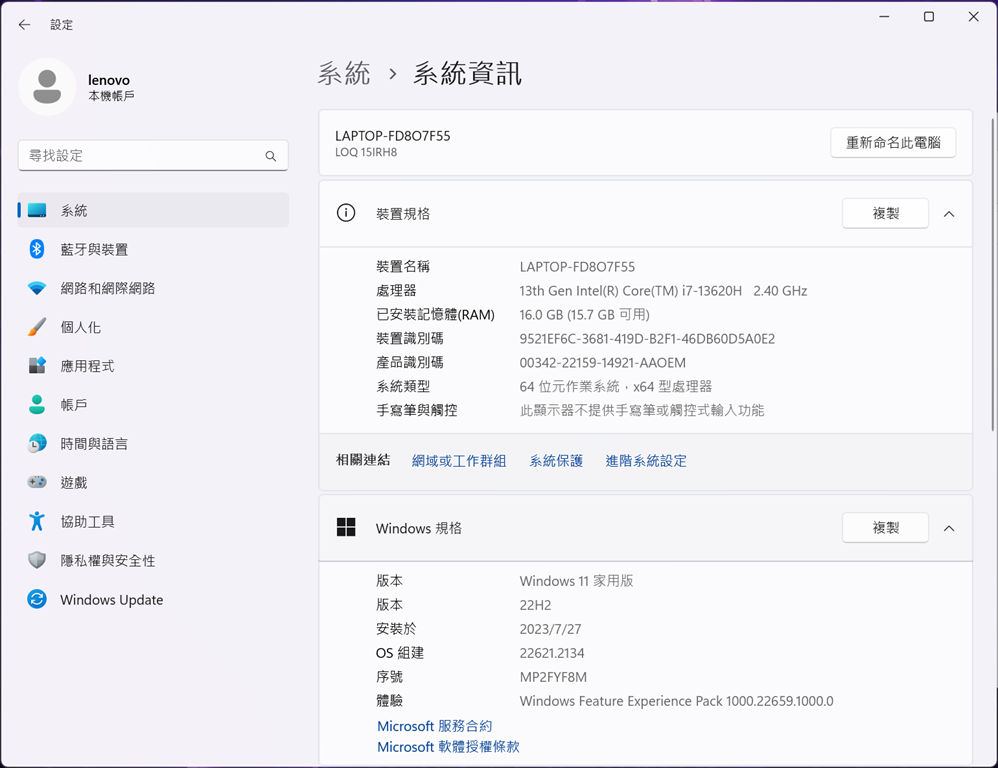 內建電競專用的 AI 晶片,搭配 Lenovo AI Engine+,可以最佳化 fps 提升遊戲順暢度。當遊戲啟動時,系統硬體和感應器會即時將資訊傳遞給 LAAI 晶片,提高 CPU 和 GPU 處理能力,進而提升遊戲順暢度。從設定裡的系統資訊可以看到 Lenovo LOQ 15 Intel 採用第 13 代 Intel Core i7-13620H 處理器,搭配 16GB 記憶體。