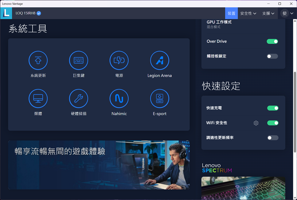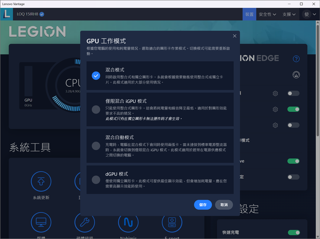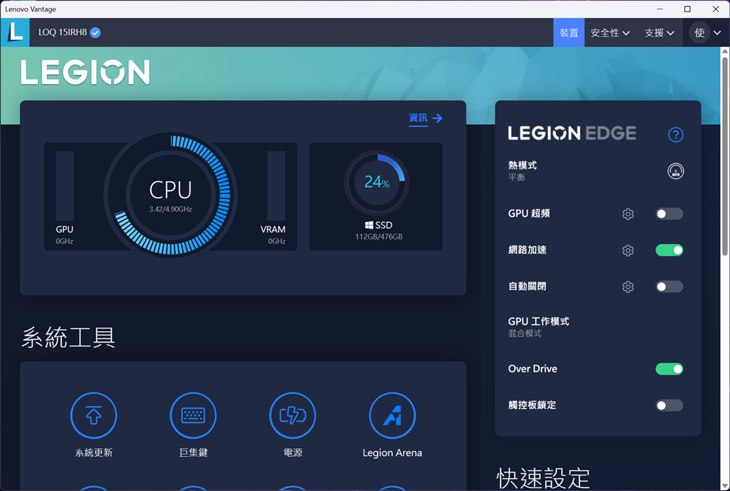 在系統工具中可以快速點選各式各樣的系統資訊,旁邊還有 Legion Edge 功能可以開啟像是 GPU 超頻、網路加速、設定 GPU 工作模式等選項。