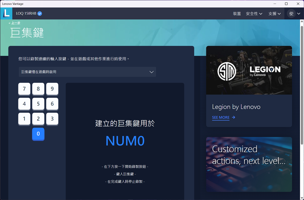 有些玩家習慣使用巨集控制連續的動作,有這類需求的使用者也可以從 Vantage 中設定。