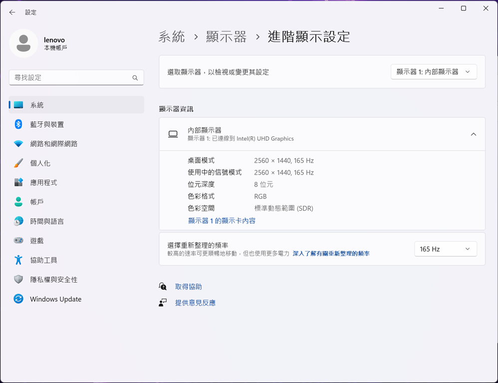 從系統裡的進階顯示設定可以看到螢幕最高支援 2560×1440 解析度、165Hz 更新率。