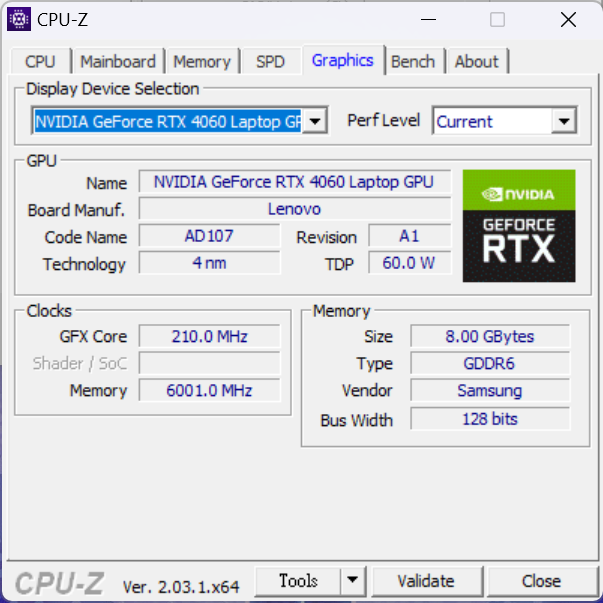 透過 CPU-Z 可以看到我們測試的這款機型,確認為第 13 代 Intel Core i7-13620H 處理器無誤,採用 Intel 10nm工藝製程,採用了 6 大核 4 小核的設計,達到 10 核 16 線程的高規格,基頻為 2.4GHz,最高可達 4.9GHz,TDP 則為 35-45W。