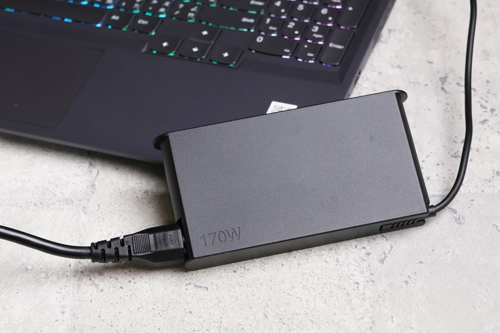 變壓器為薄型設計的 170W 變壓器,不過畢竟是 170W 高輸出,所以還是有一定體積,幸好有配備 USB-C 充電埠,外出時如果不想攜帶變壓器也可以透過 USB-C 充電。