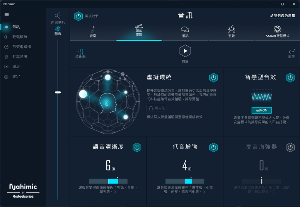 既然是為電競而生的筆電,當然除了顧及高更新率的大螢幕之外,音效也是不可少的一環,Lenovo LOQ 15 Intel 內建 SteelSeries 設計的 Nahimic Audio 音訊軟體,可以針對不同使用情境最佳化音訊效果,例如音樂、電影、通訊、遊戲時都可以設定自訂的聲音表現,或是透過 SMART 智慧模式讓電腦自己依照使用情境而調整,不論是要強化語音的清晰度、增強低音效果,或是讓虛擬環繞音效聽感更立體都行,這樣在遊戲時如果要開語音和隊友溝通、想要直播遊戲畫面,或是單純的強化低音讓遊戲音效更渾厚都能有對應的選項可以調整。