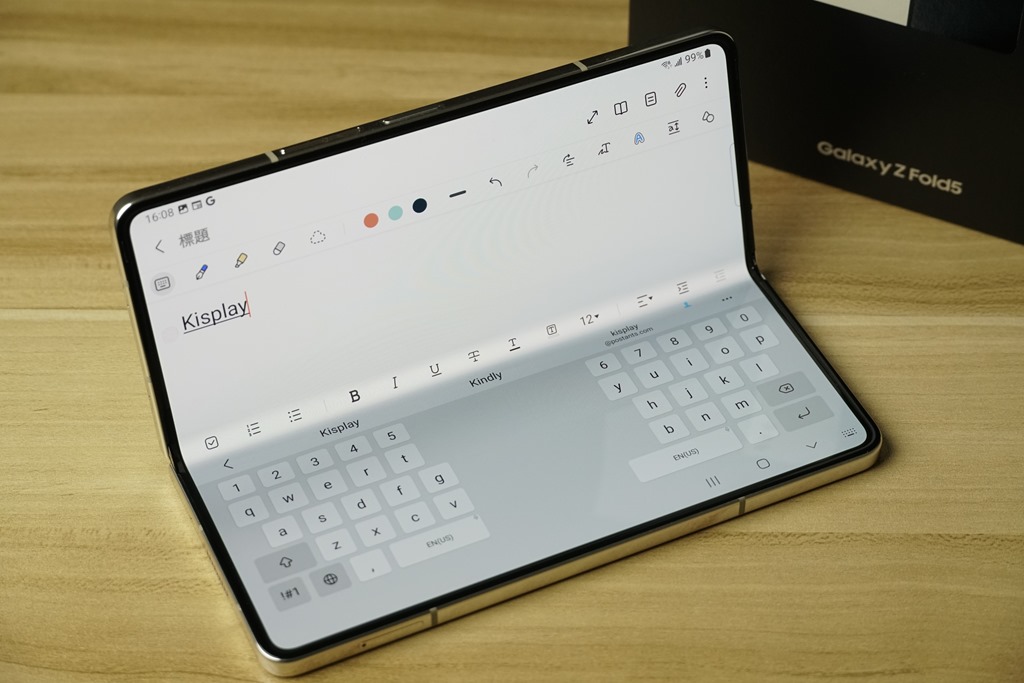 摺疊後的 Fold5 就如同小筆電般,點選文字輸入後,就會在下方螢幕打開鍵盤,直接在上面就可以用兩隻手進行輸入。