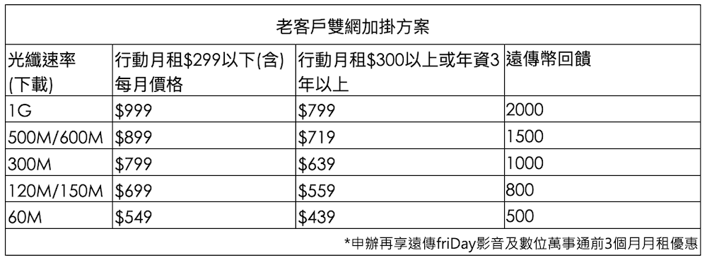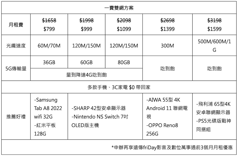 除免費升速,遠傳大雙網現也推出超值優惠,只要月付 799 元起,就能同享 5G 行動網路及家用光纖高速上網,不僅費用較個別申辦省下一半,還有 OPPO Reno8、Samsung Tab A8 平板、SHARP 42 型安卓顯示器、PS5 等熱門 3C、家電 0 元起帶回家;遠傳老客戶加辦家用光纖上網再享優惠,60M 月租僅 549 元,如行動月租月付 300 元以上或年資 3 年以上,家用光纖月租再打八折只要 439 元,相當每日只要 15 元,現申辦還加碼回饋最高 2,000 遠傳幣,可到遠傳 friDay 購物購買任何想要的開學商品。
