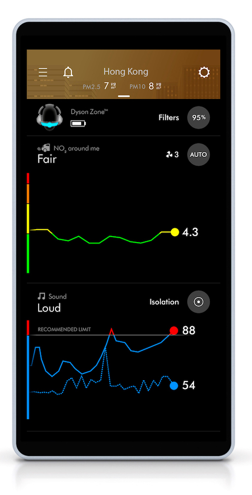 使用者也可透過 MyDyson 應用程式控制 Dyson Zone 耳機,調整氣流速度和降噪模式,以及根據喜好調整音效均衡器,從三種模式中選擇:Enhanced(強化模式)、Bass Boost(低音加強模式)和 Neutral(中性模式)。 MyDyson 應用程式隨時以視覺化形式呈現空氣品質及環境噪音情況,保障聽覺與呼吸道健康,安心享受伴隨身旁的動人音色及潔淨空氣。