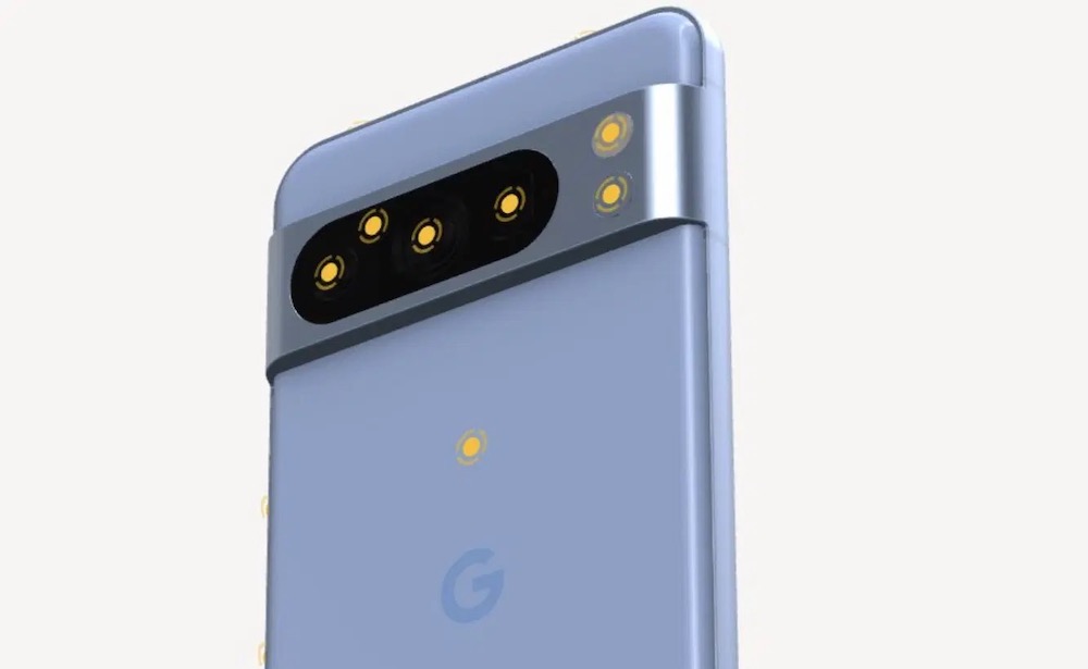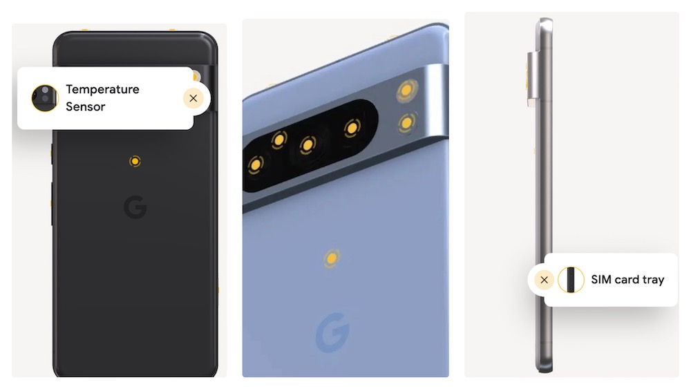 根據 Pixel Simulator 網站的資料指出,此次 Pixel 8 Pro 會有黑、藍、瓷白 3 色外,還用黃點標出了各個感測器的位置。機身背後的確承襲了 Pixel 6 系列起的突起鏡頭條狀設計,其中包括了三顆鏡頭與一顆 LED 閃光燈,旁邊還分有著一個麥克風與一個溫度感測器。