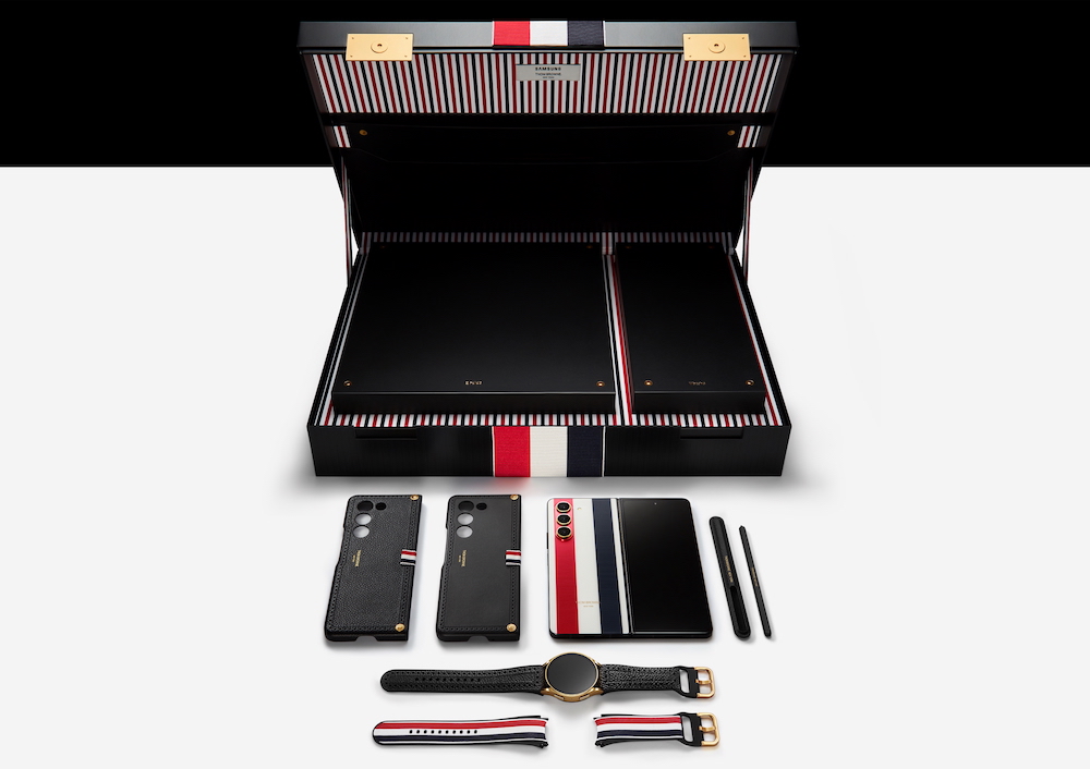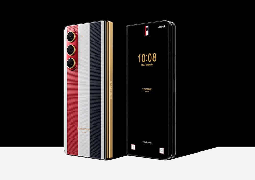 Galaxy Z Fold5 Thom Browne Edition 採用三星最新的摺疊技術,同時致敬 Thom Browne的經典設計元素,以黑色荔枝紋皮革、羅緞條紋點綴細節。時尚前衛的造型在一系列的設計元素點綴下,更顯卓越不凡:Thom Browne 經典的紅、白、藍三色條紋;機背玻璃蝕刻織物紋理;出色的黑色邊框搭配金色轉軸;以及圍繞相機鏡頭的金色圓環。Galaxy Z Fold5 Thom Browne Edition 亦推出二款獨特設計的皮質保護殼,以及其專屬 S Pen,讓完美一次到位。