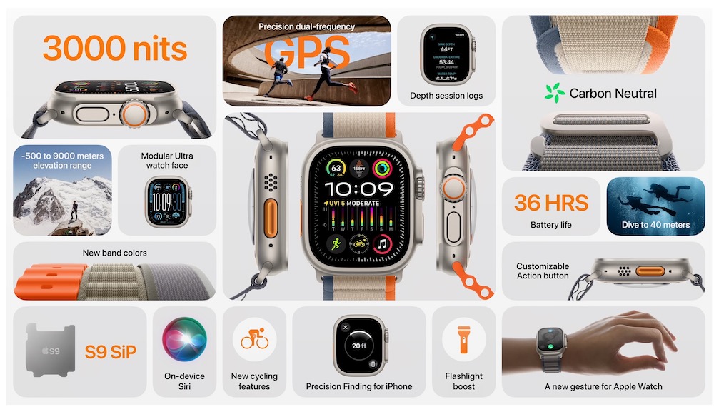 Apple Watch Ultra 2 採用 49 公釐錶殼,在搭配越野錶環或高山錶環時達成碳中和。三款錶環與錶帶皆推出新色:高山錶環 (藍色、靛藍色、橄欖色)、越野錶環 (橘色配米色、綠色配灰色、藍色配黑色) 與海洋錶帶 (藍色、橘色)。
