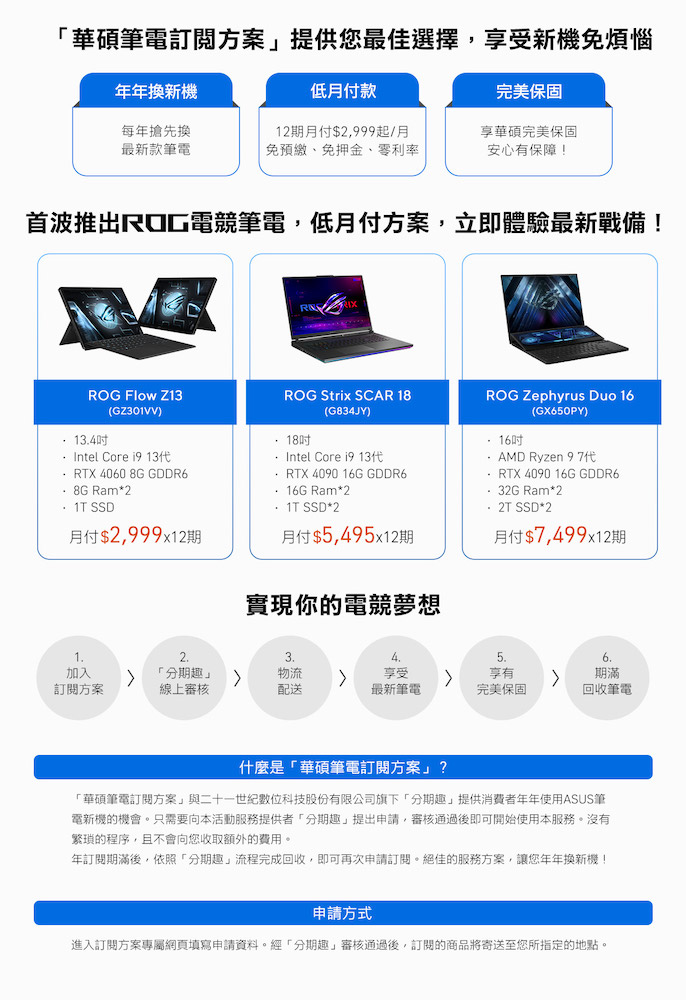 華碩筆電訂閱方案程序簡便,僅需透過 21st FinTech 旗下「分期趣」支付平台申請,通過審核,筆電配送到府,12 期輕鬆月付,無其他衍生費用;訂閱期滿完成回收流程,就能再次申請筆電訂閱,每年更新電競戰備,保持頂級遊戲體驗。
