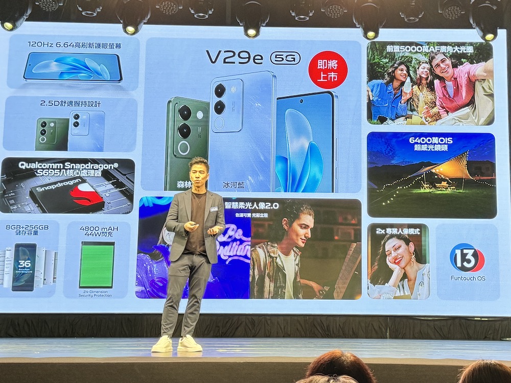 平面螢幕的 V29e 5G 則是 6.67 吋螢幕,採用高通 S695 八核心處理器、8GB+256GB 記憶體容量組合、相機為 6400 萬像素 OIS 主鏡頭與 800 萬像素廣角鏡頭,前置鏡頭為 5000 萬像素,4800mAh 電池容量,支援 44W 閃充。共有冰河藍與森林黑,預計 11 月 1 日上市。