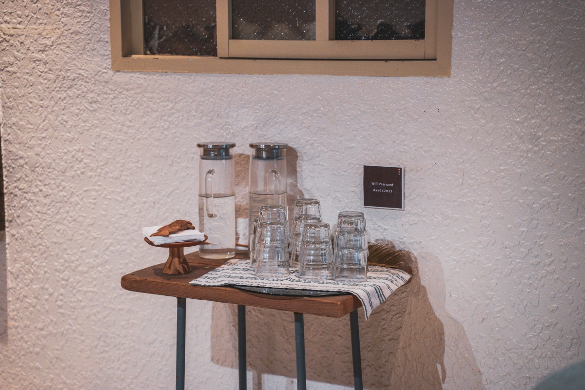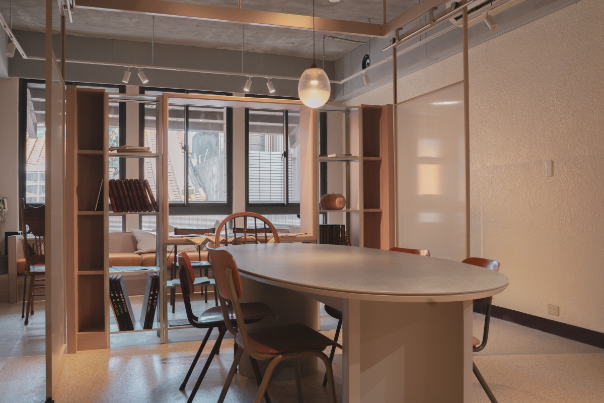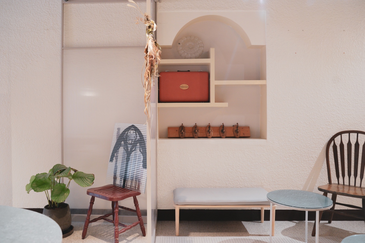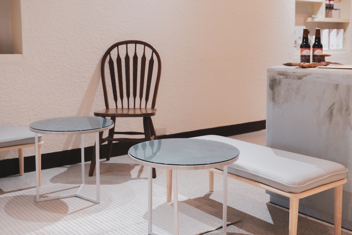 空間不大,但在設計上透過開放式書櫃與玻璃屏風來分隔用餐空間,讓整體空間看起來是開放性的,帶有隱私卻不影響視覺感,顏色的搭配也別具巧思,深淺木色搭配品牌的灰藍色,在整個空間從桌椅的細節大到一眼望去吧台的色調都是相同的色彩搭配,仔細看到杯水自助的區域也是,有趣。比起一般咖啡館常用的淺木色與白色系搭配的簡約感,就日在其中做出了更活潑的細節設計,好喜歡!